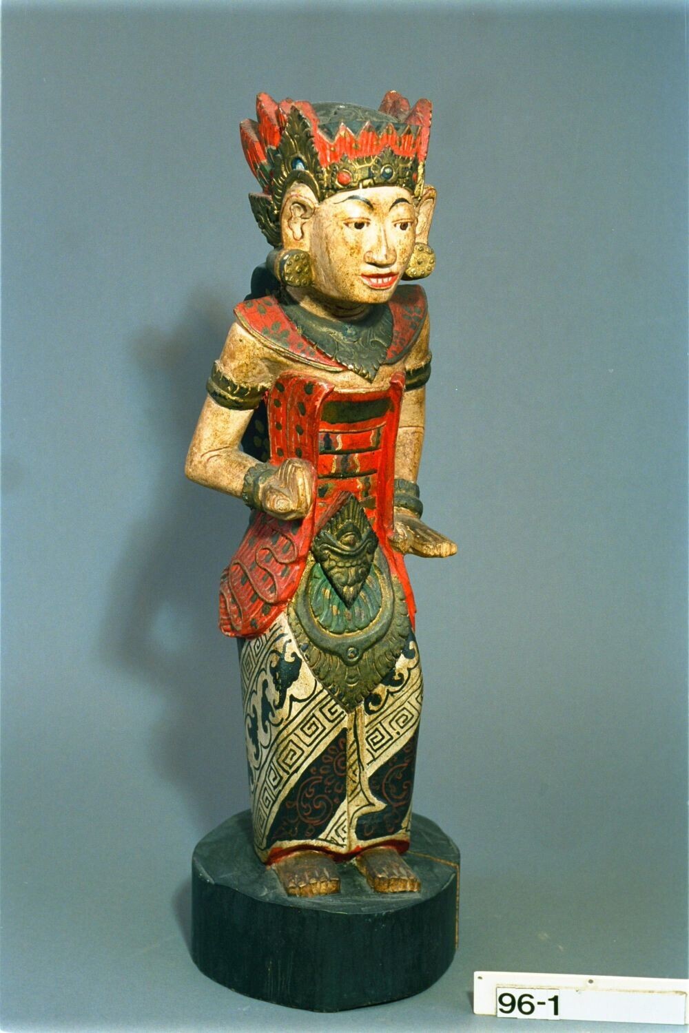 Houten beeld van een wajangfiguur in vorstelijke kle...