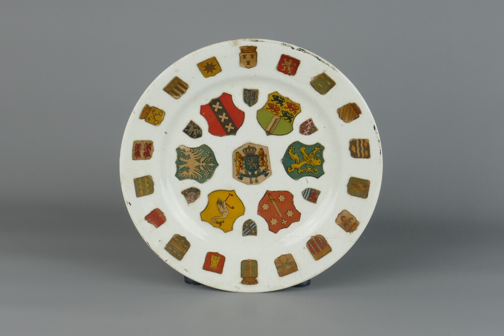 bord gedecoreerd met verschillende wapenschilden van...