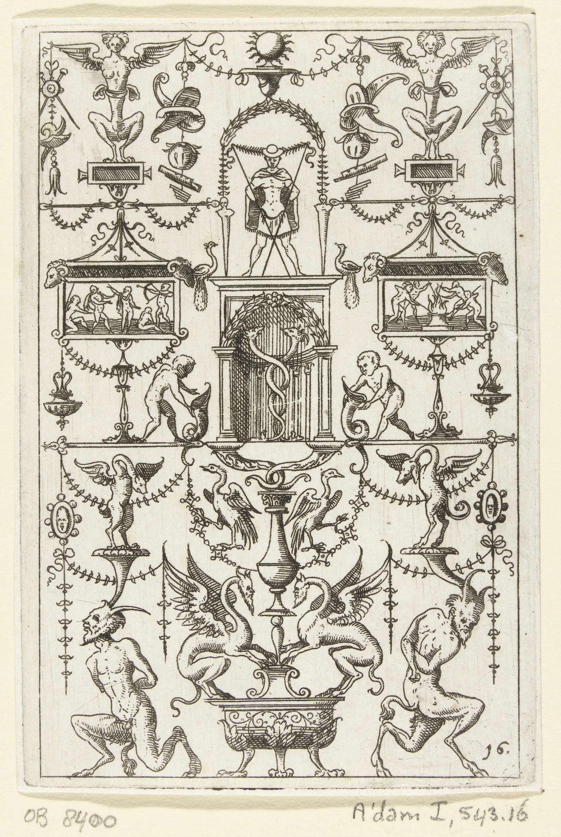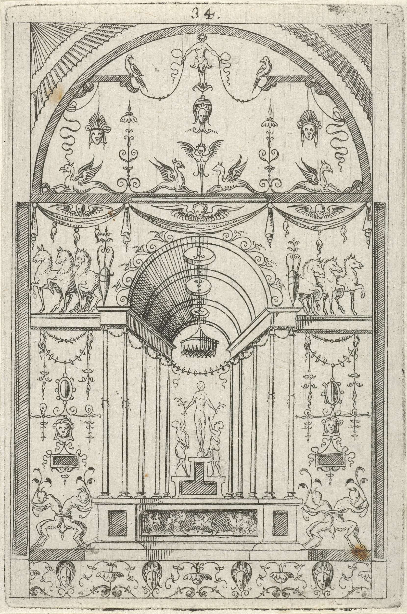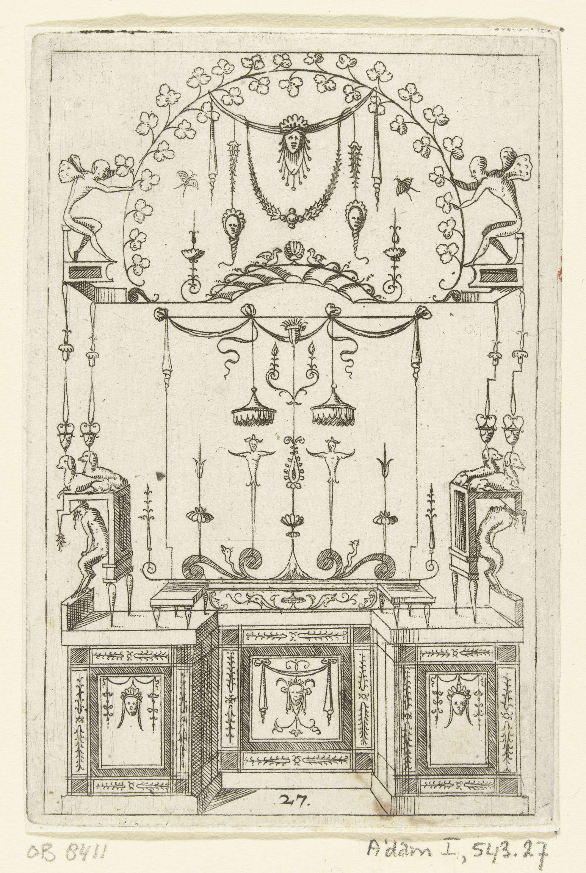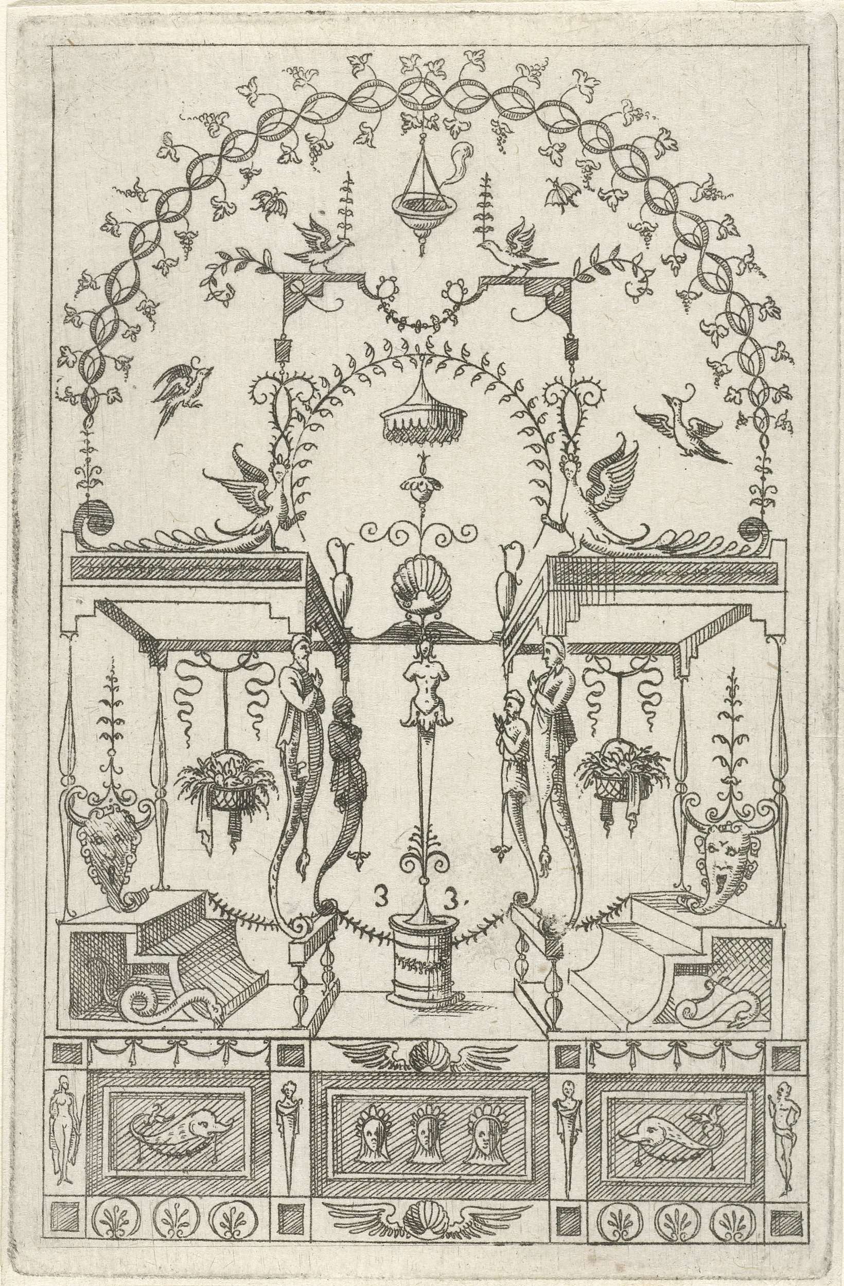 Op een sokkel, gedecoreerd met mascarons, staat een ...