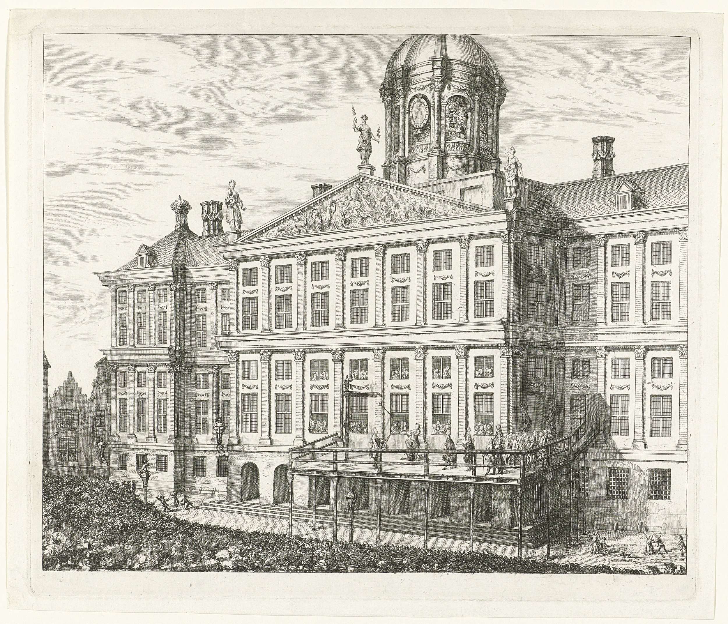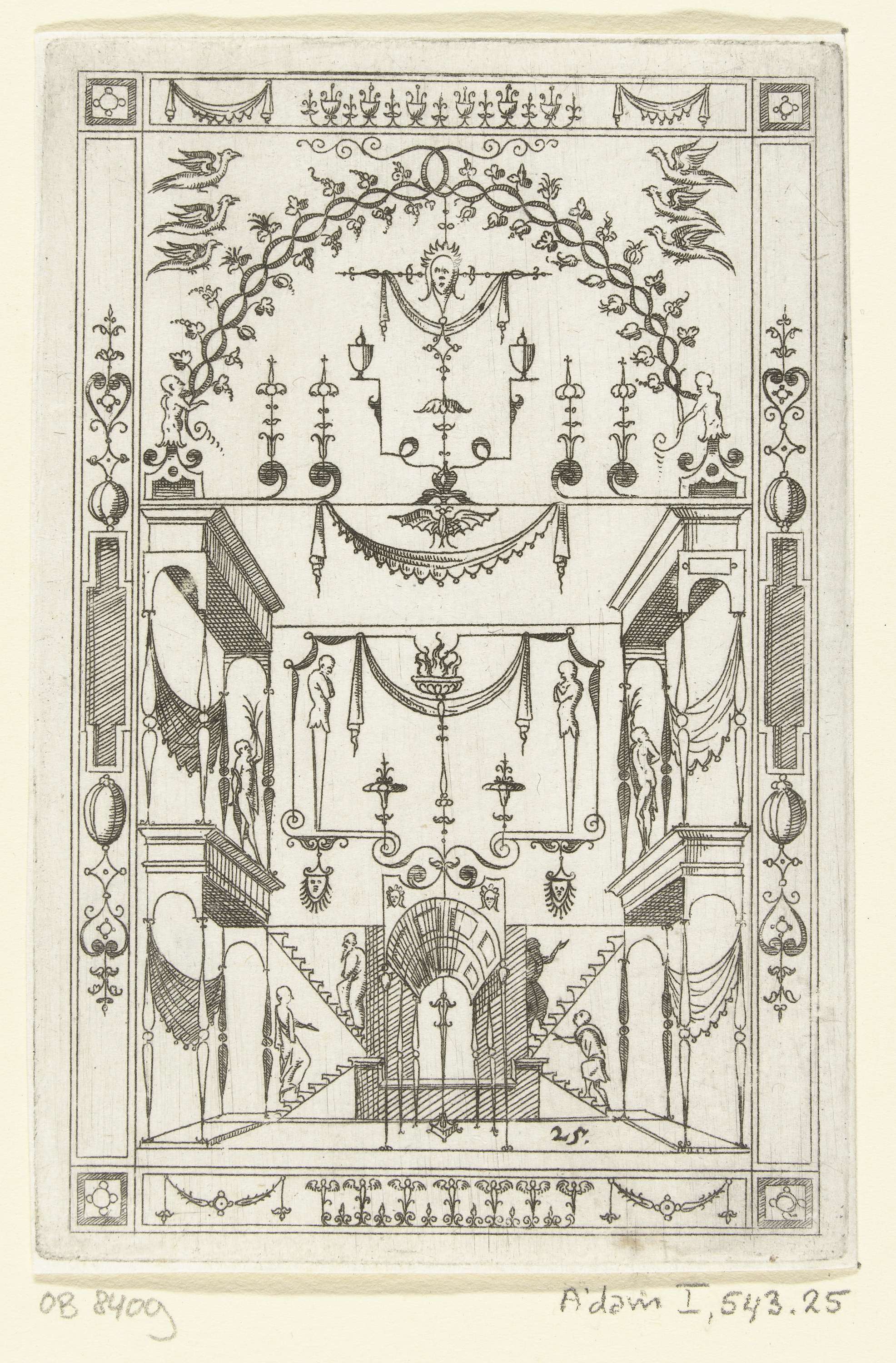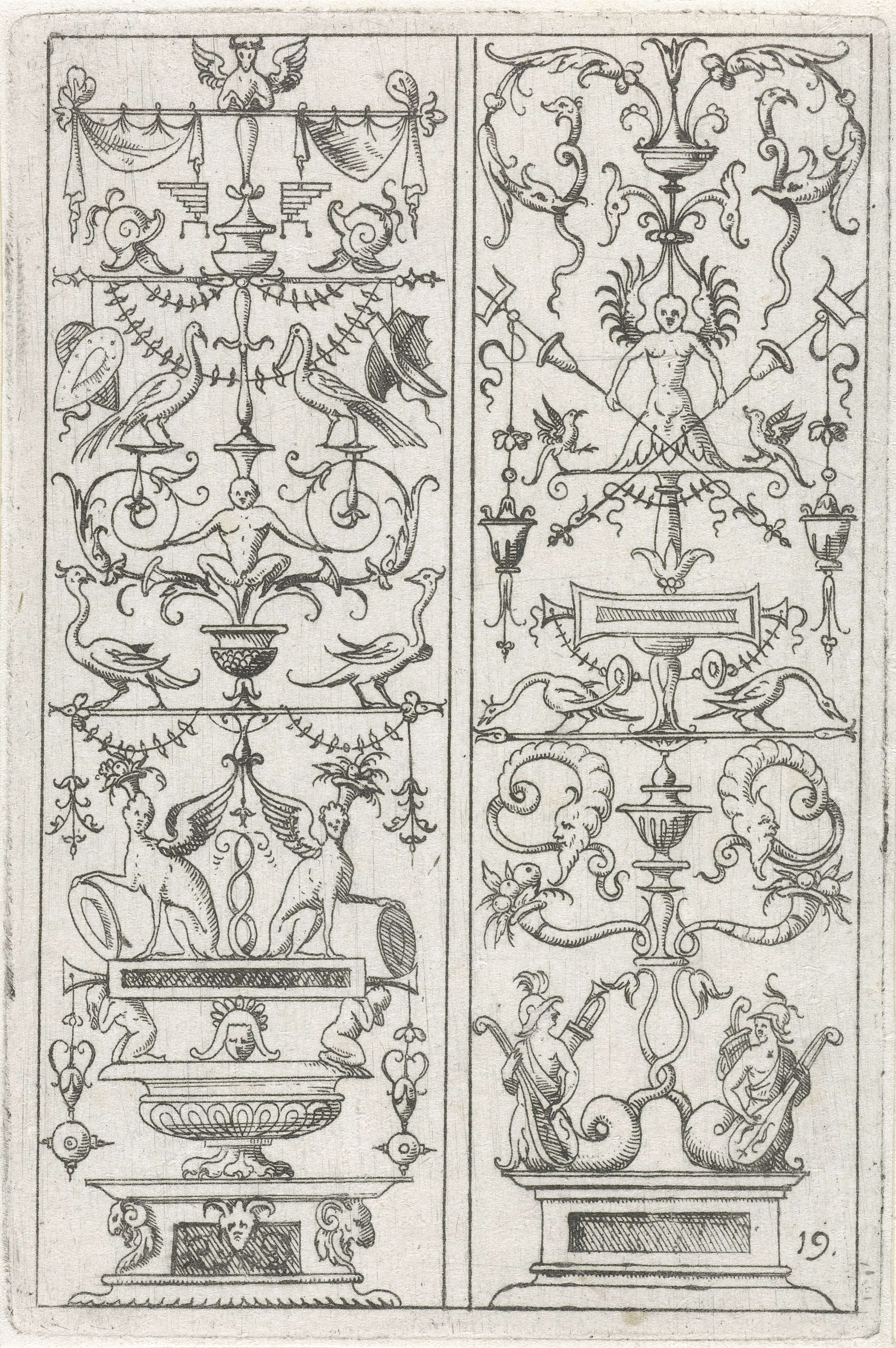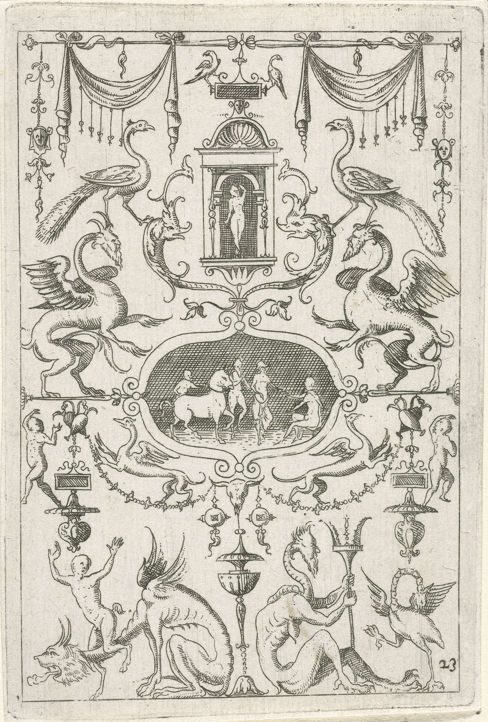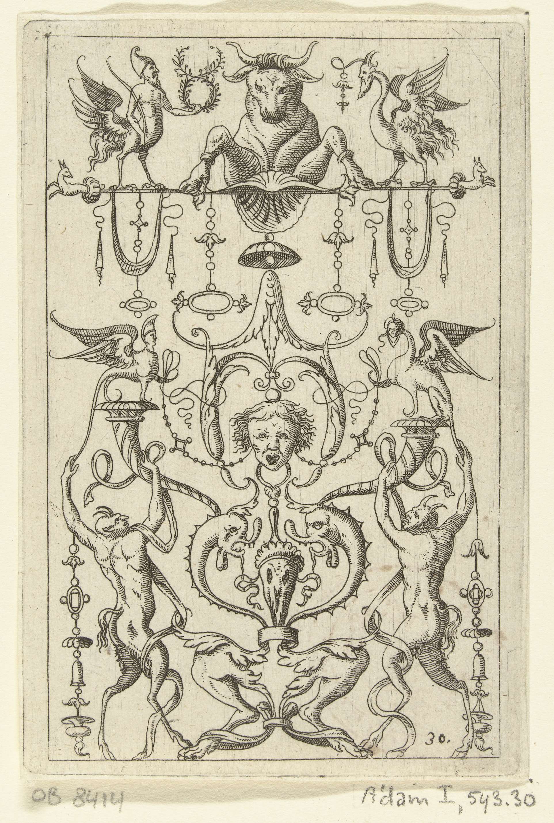 Op een sokkel, gedecoreerd met mascarons, staat een ...