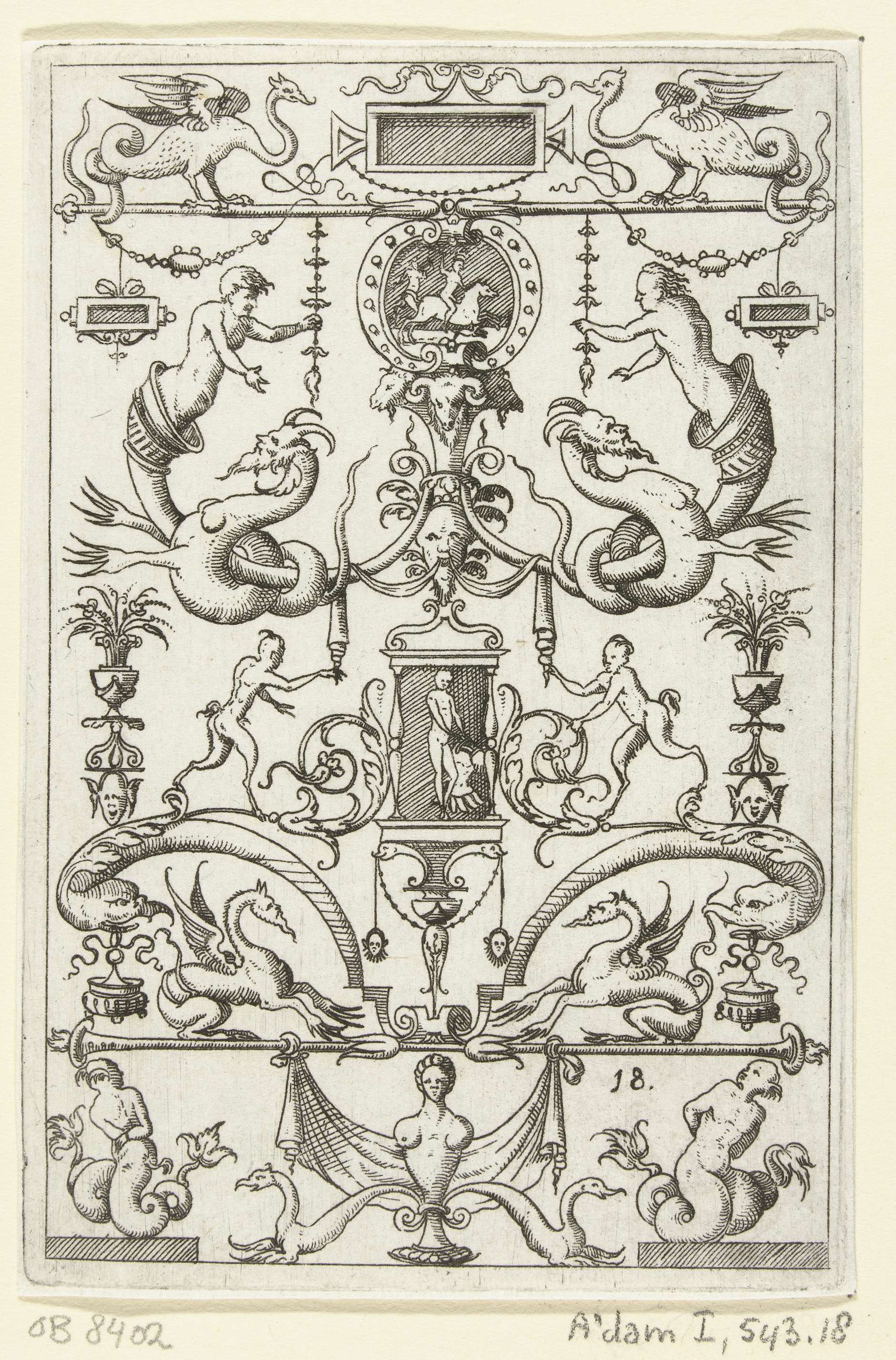 Op een sokkel, gedecoreerd met vissen en mascarons, ...