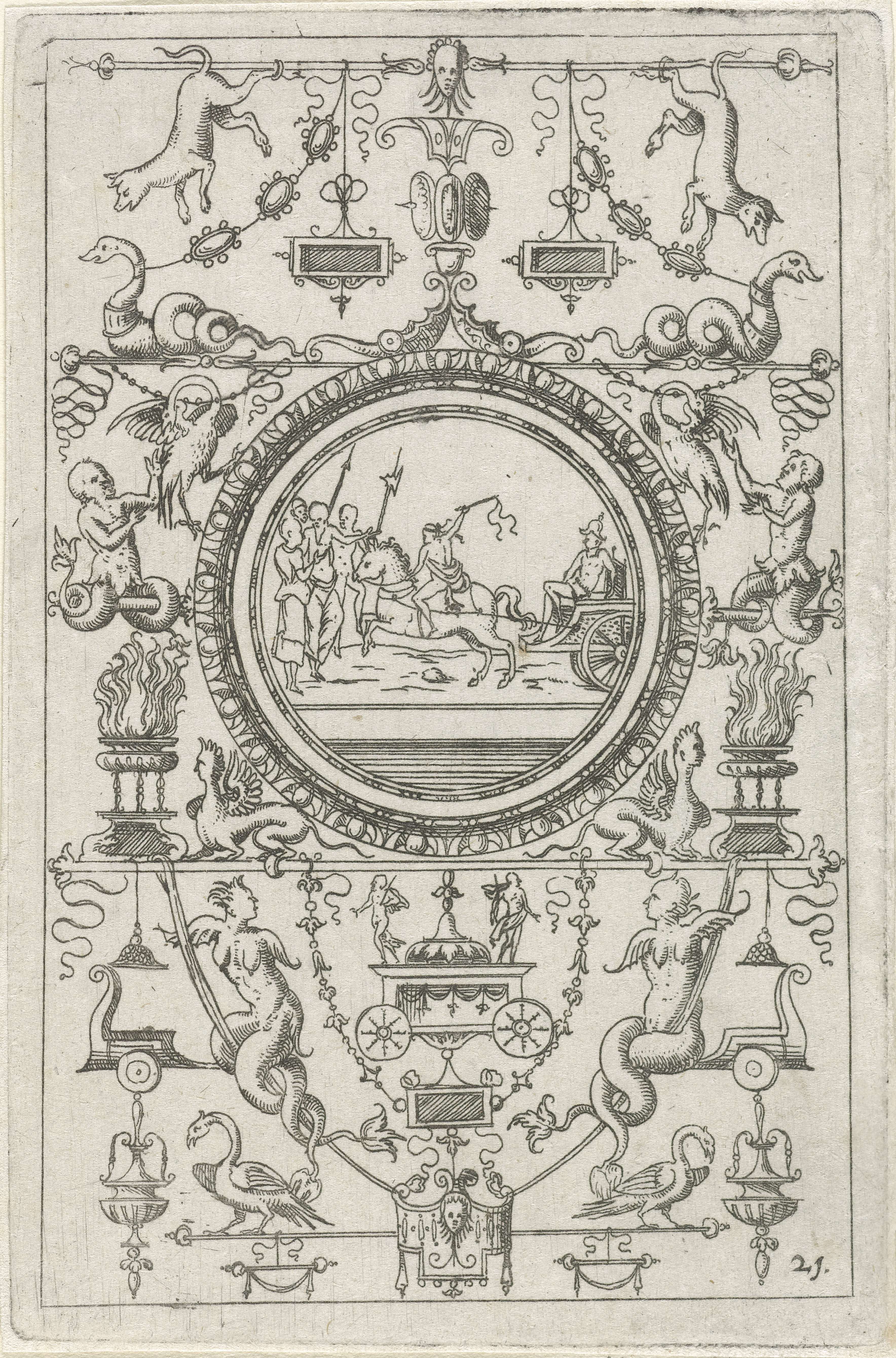 Medaillon met een man op een wagen, getrokken door e...
