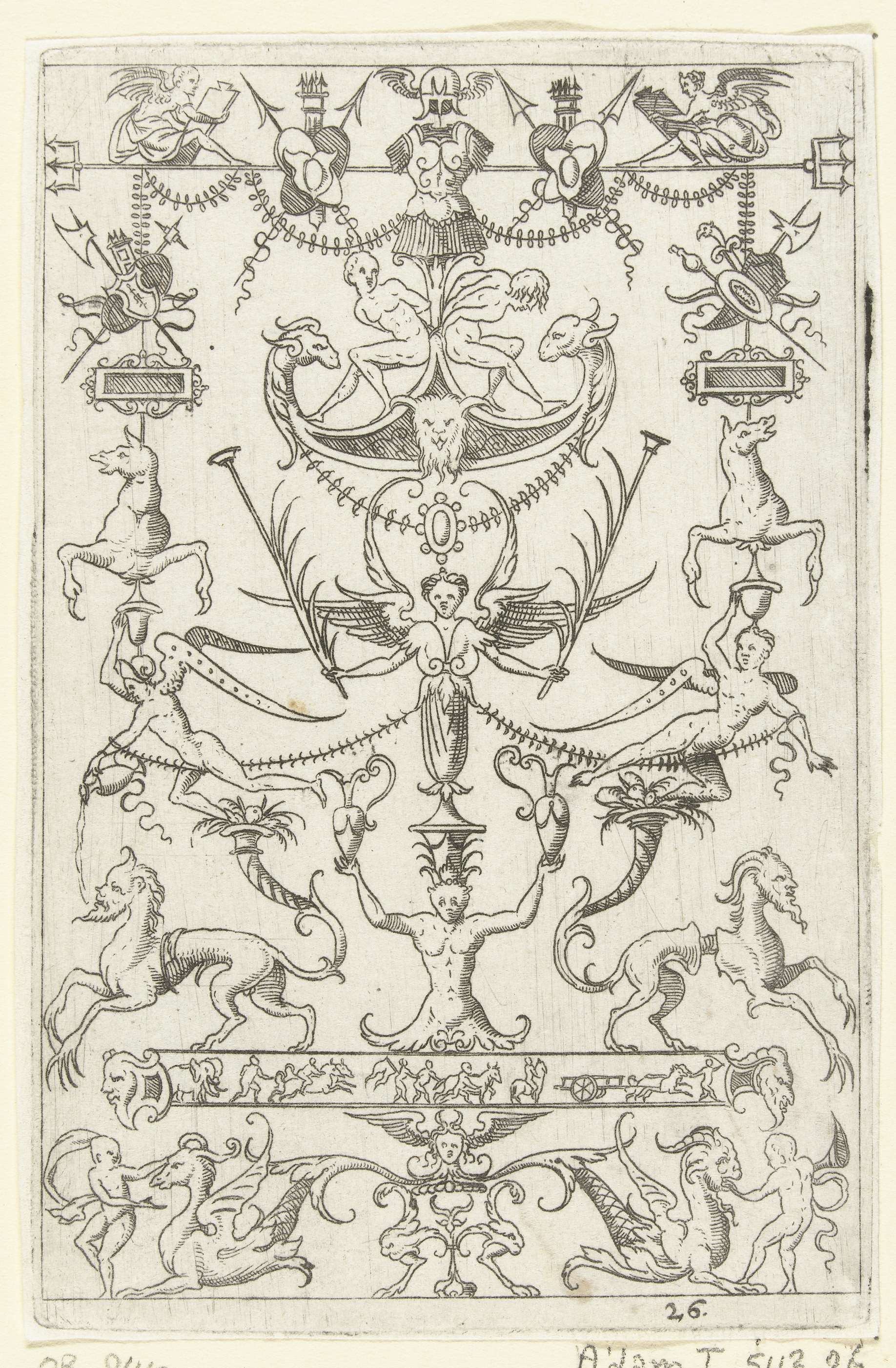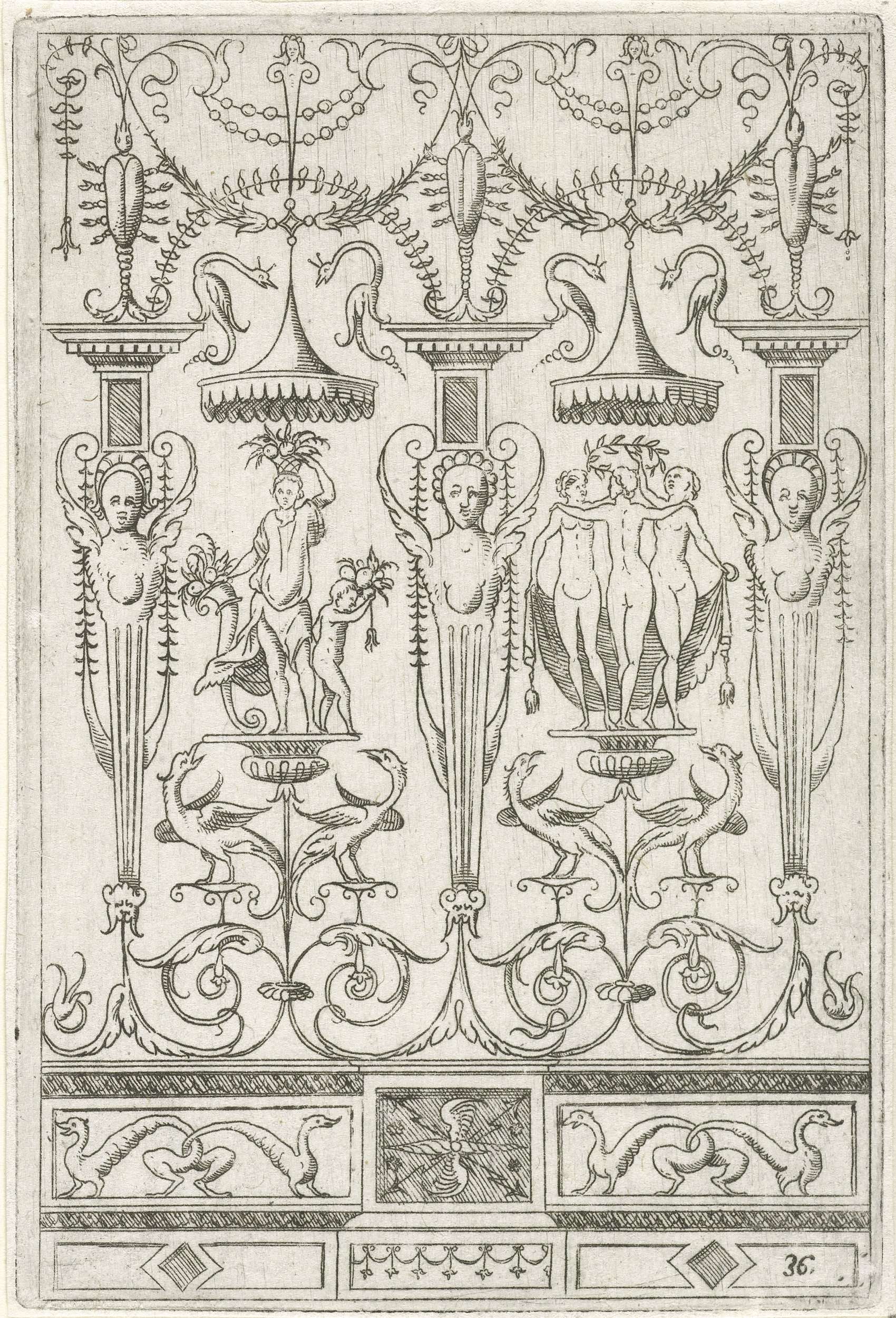Op een fries staan drie gevleugelde vrouwelijke hermen