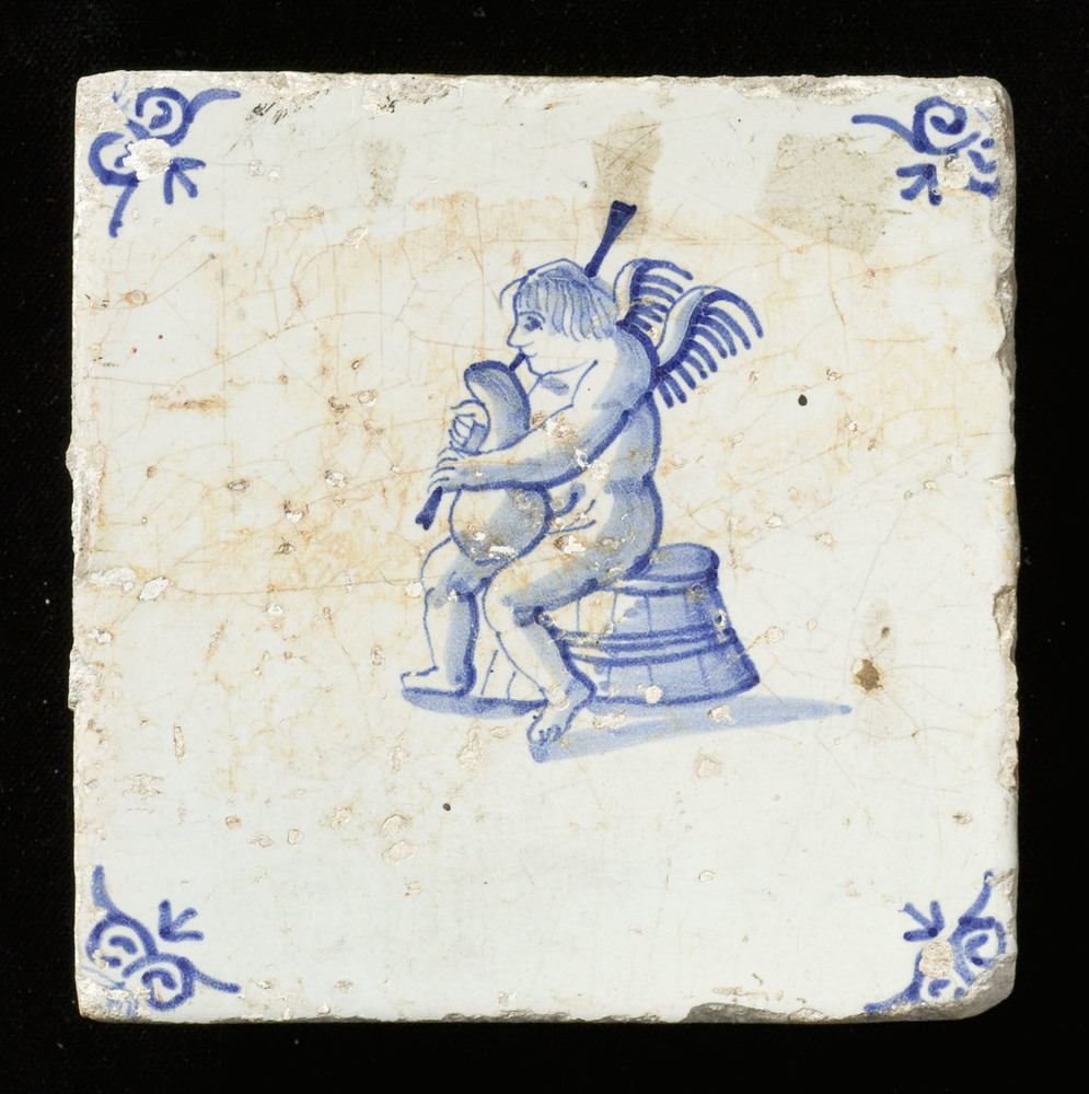 Tegel in tinglazuur, voorstellende een cupido/engel ...