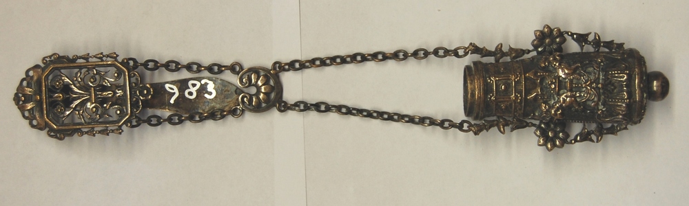 gordelgarnituur met koperen kokertje in de vorm van ...