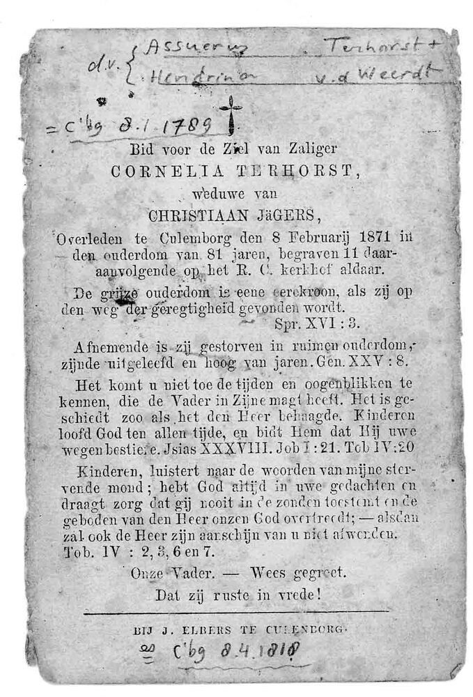 bidprent voor Cornelia Terhorst. Geboren 1790. Overl...