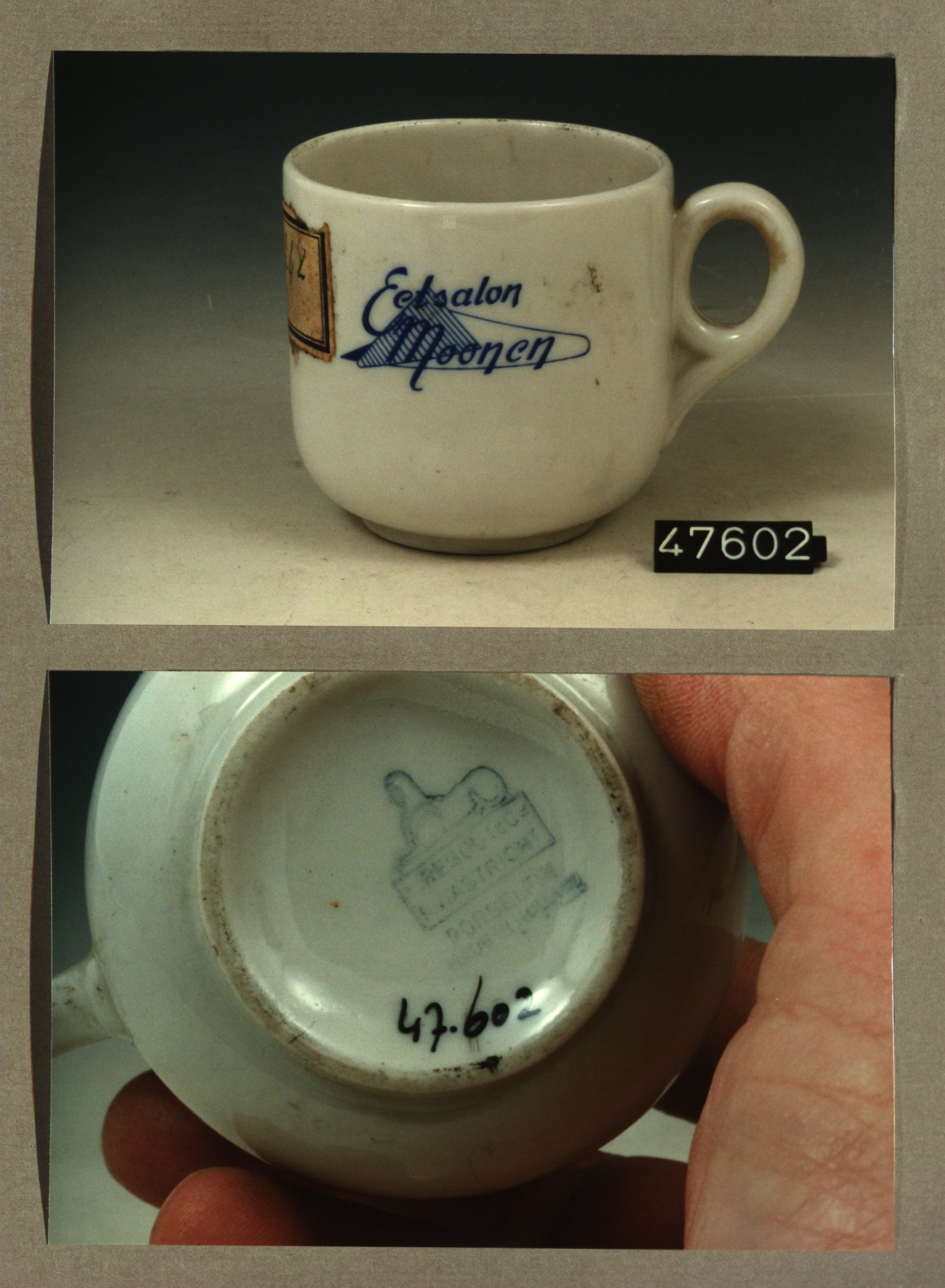 Kop met opschrift, model F met decor Eetsalon Moonen