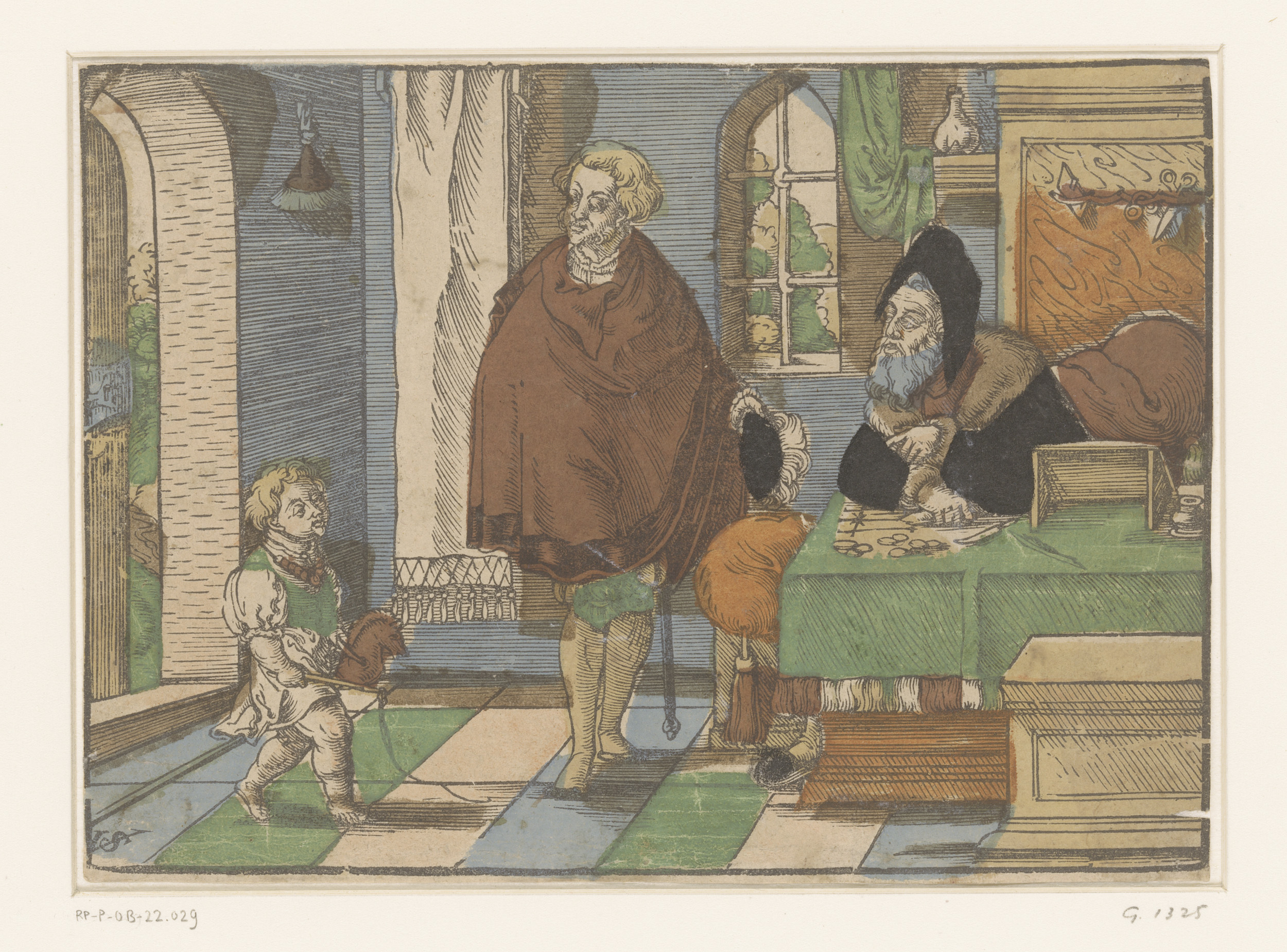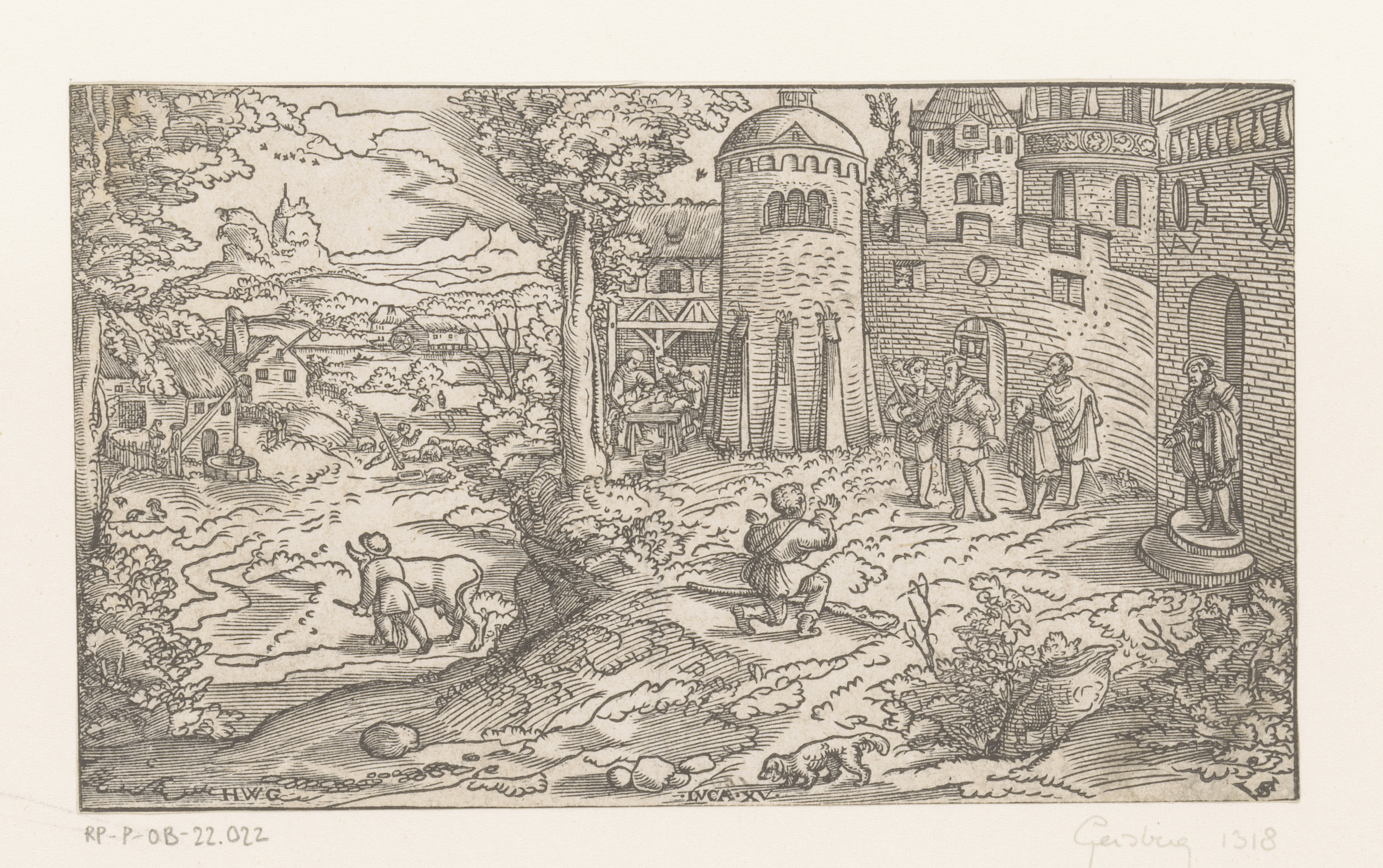 Satire met een vrouw die een ezel vast houdt bij de ...