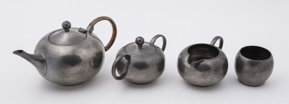 Theeservies van oud tin, vervaardigd door Metaalware...