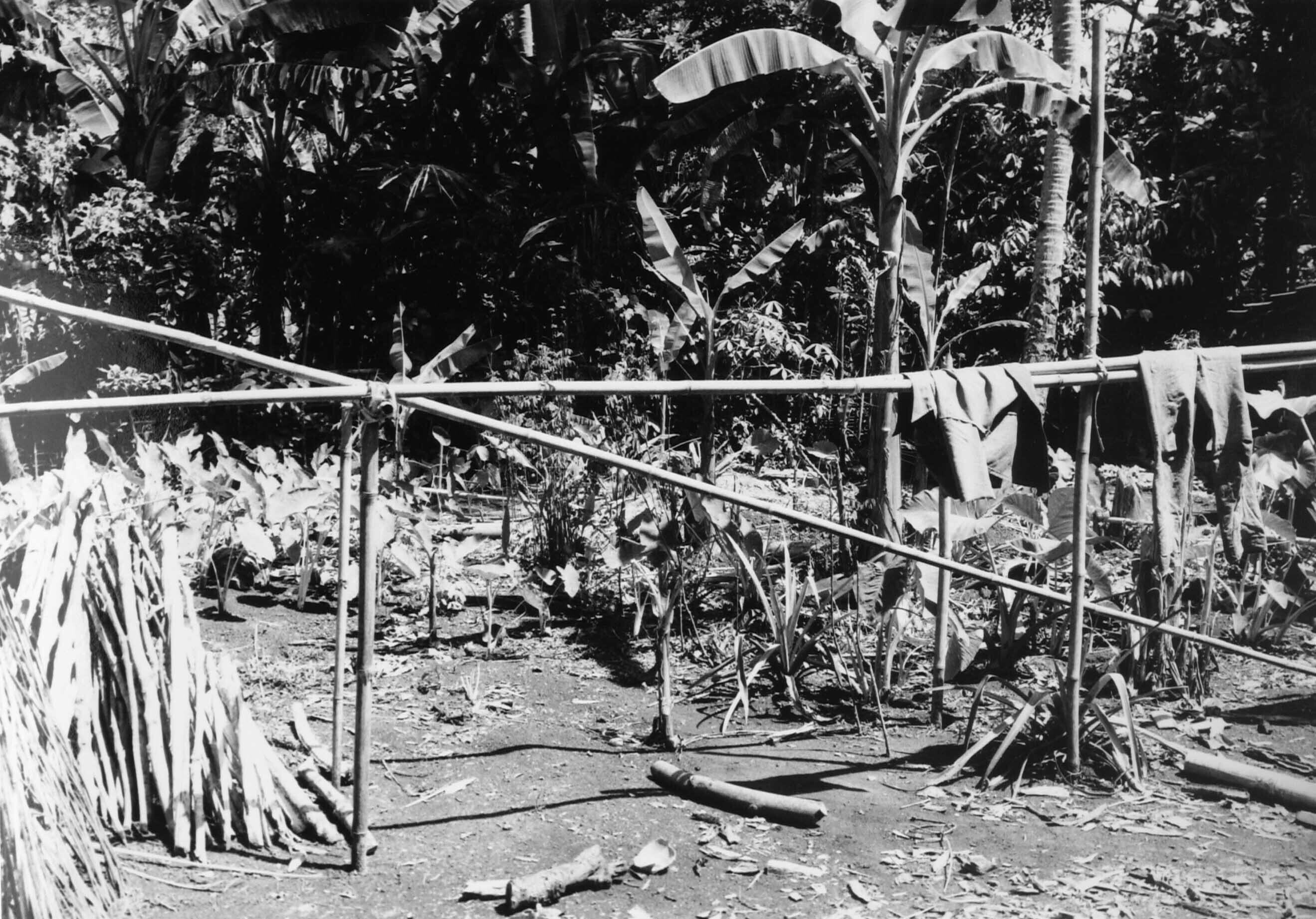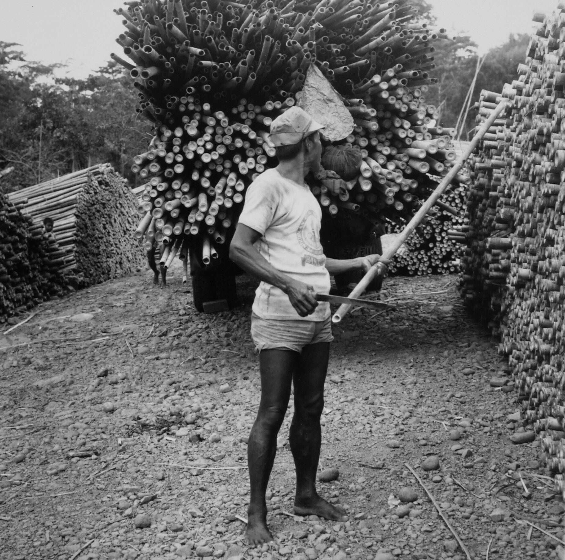 Het stapelen van de bamboe’s met op de achtergrond d...