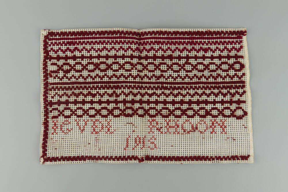 Merklap van katoen met letters in wollen borduurgaren.