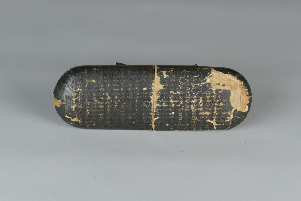 Bril met metalen montuur in koker van zwart karton.