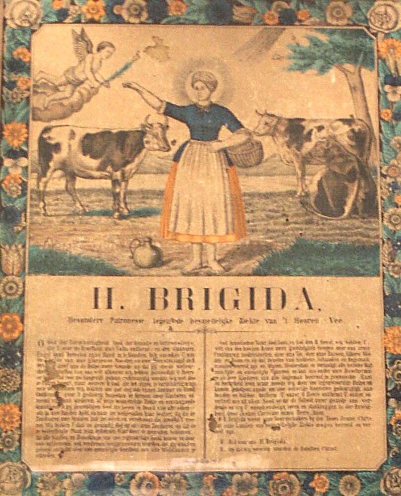 Prent in kleur, voorstellende de heilige Brigida bes...
