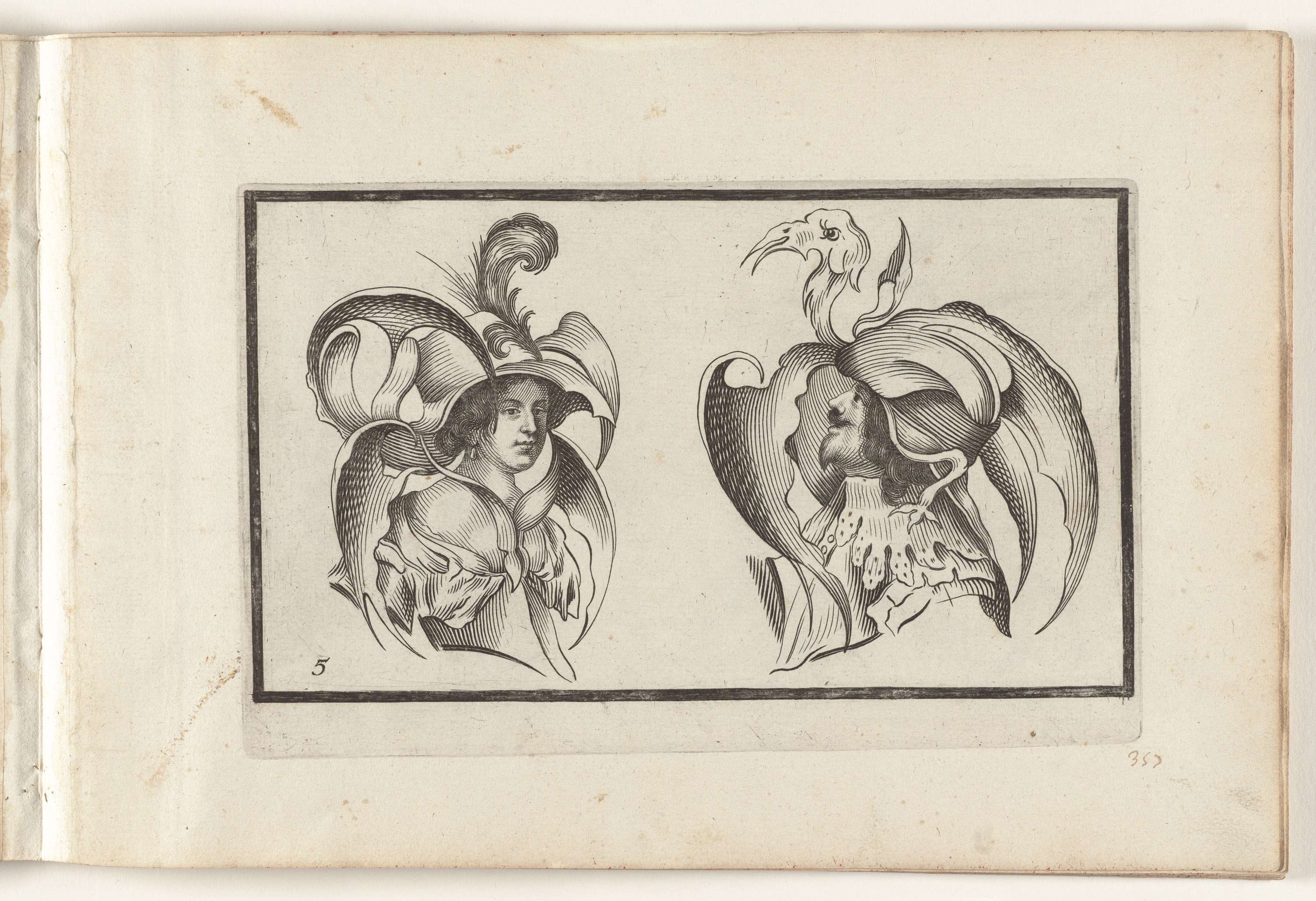 Twee koppen met groteske hoeden en kragen