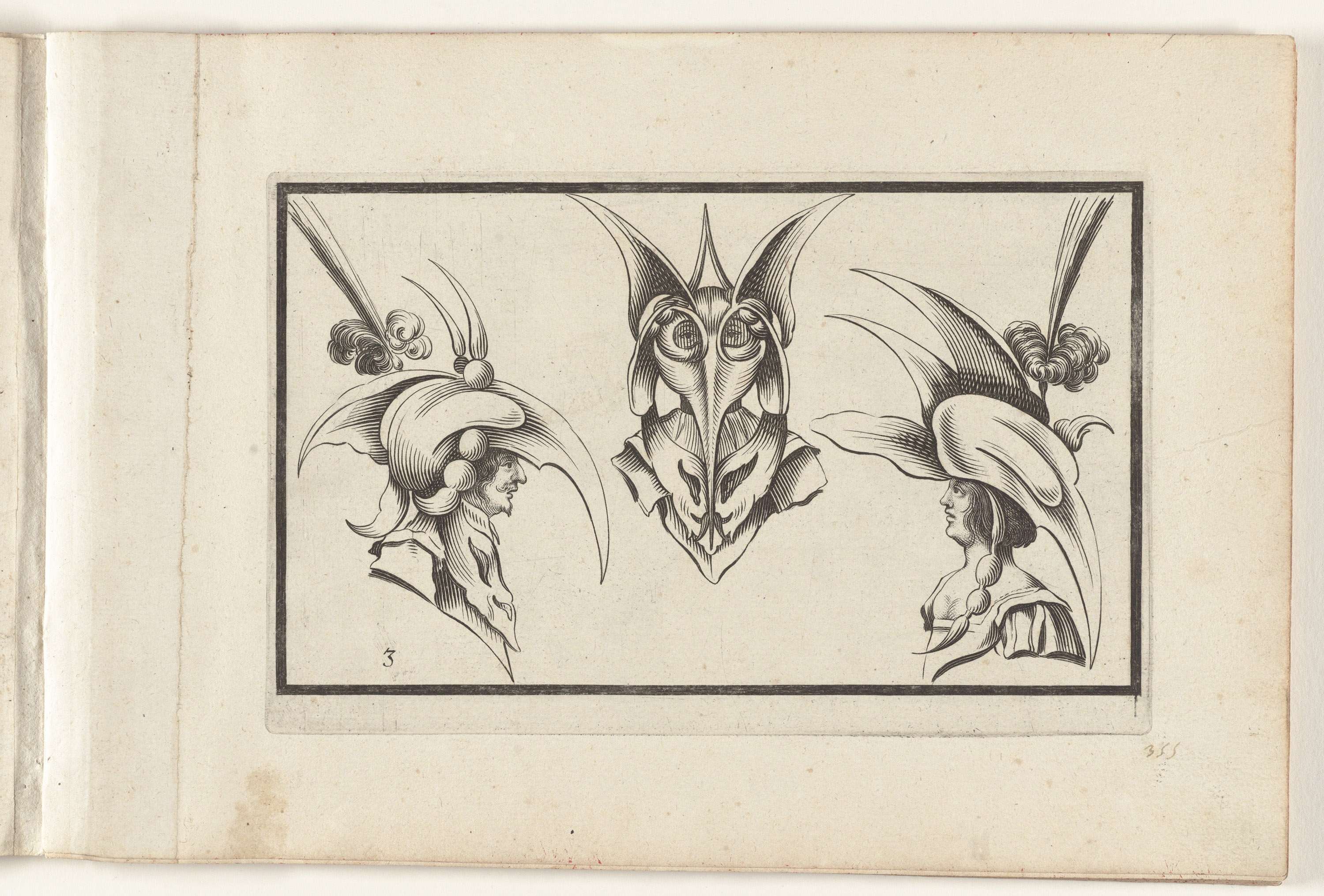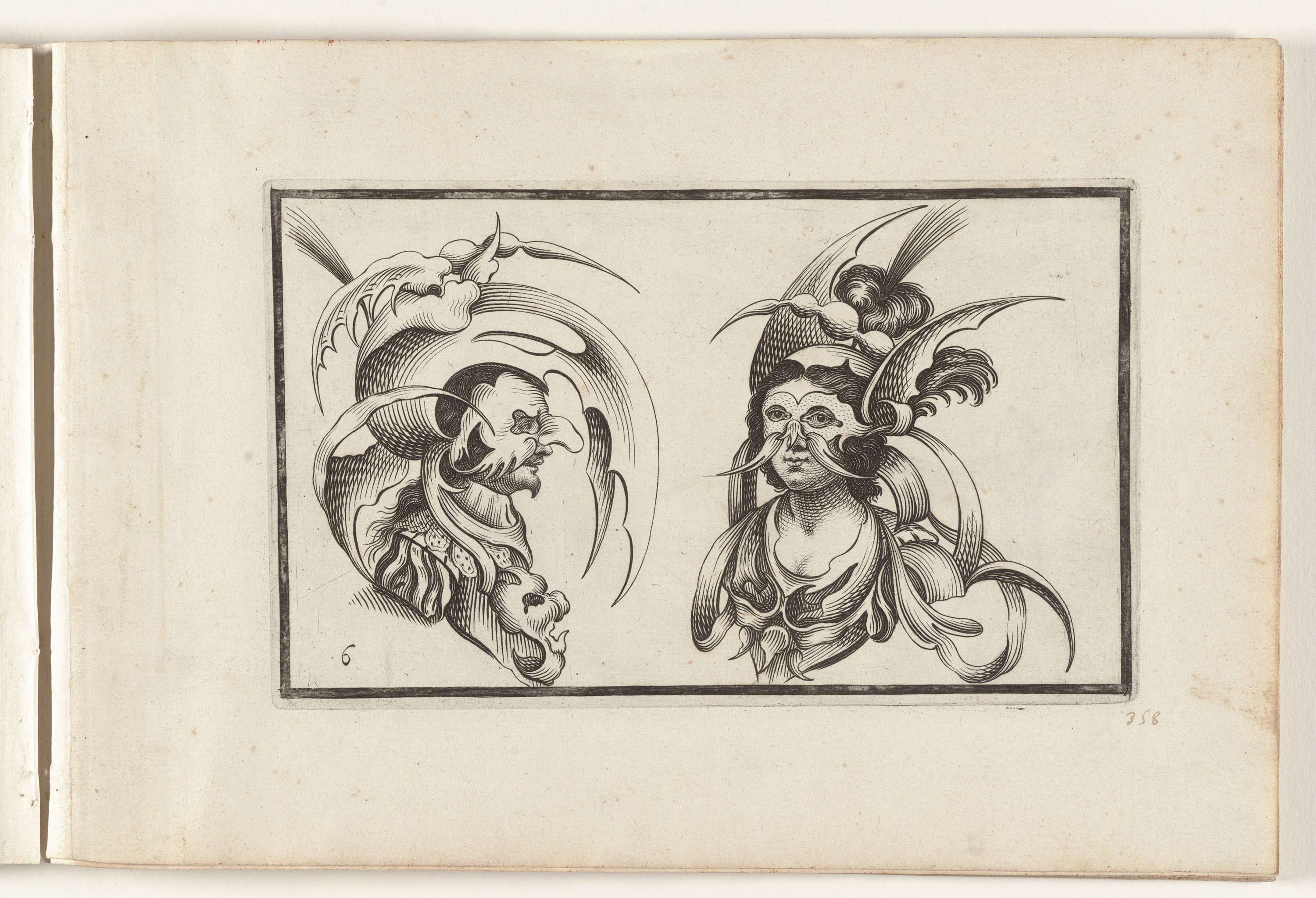 Twee vrouwenkoppen met maskers en groteske hoofdbede...