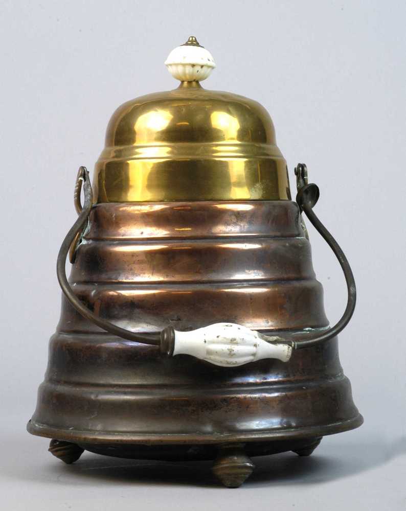 koperen doofpot met deksel en hengselen, met porcele...