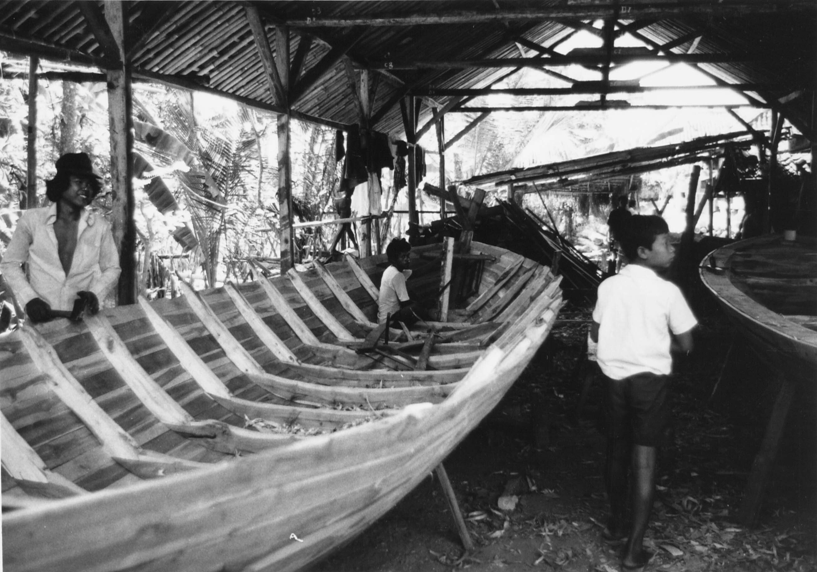 Het bouwen van een boot waarmee zand uit de rivier w...