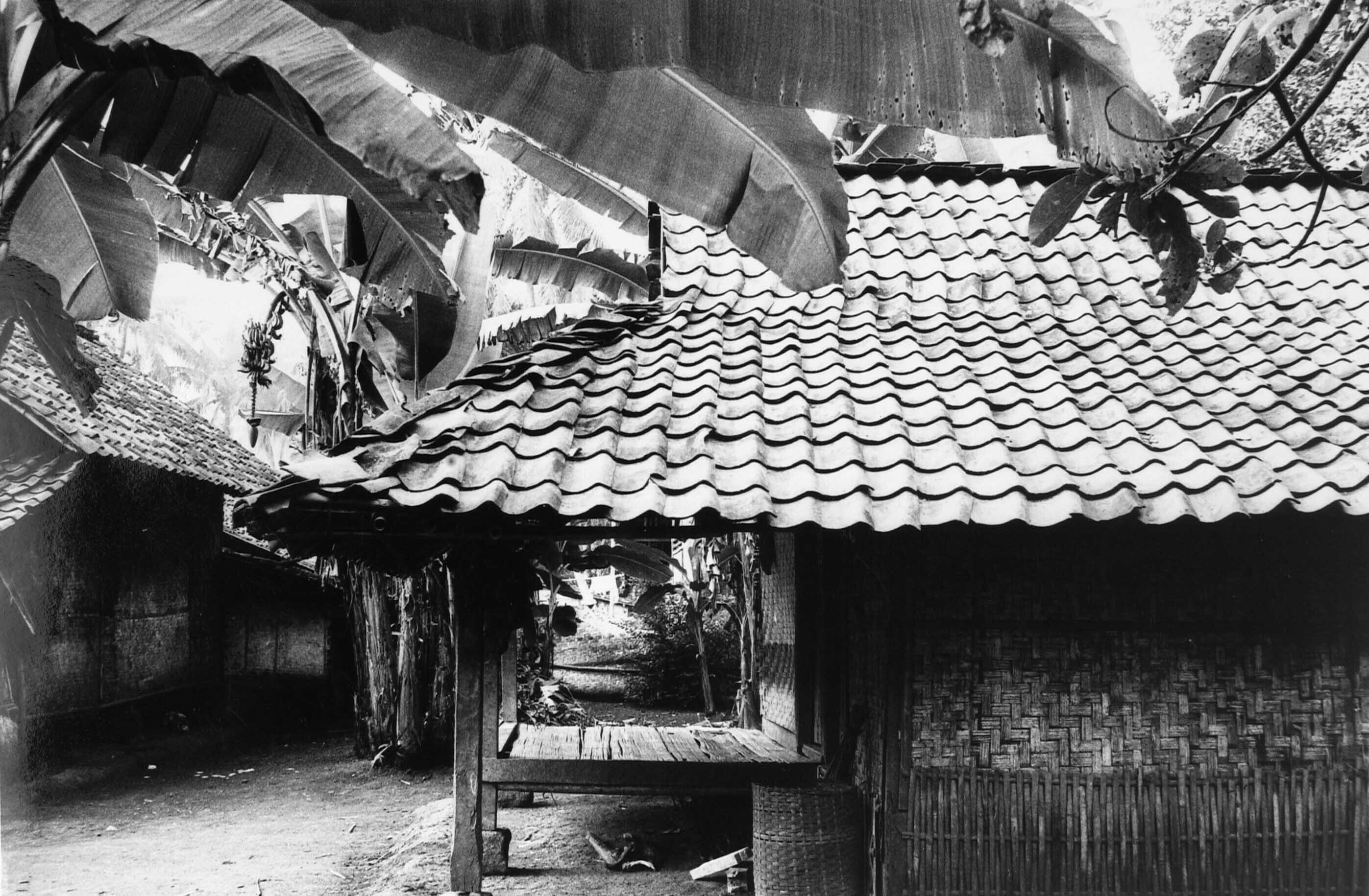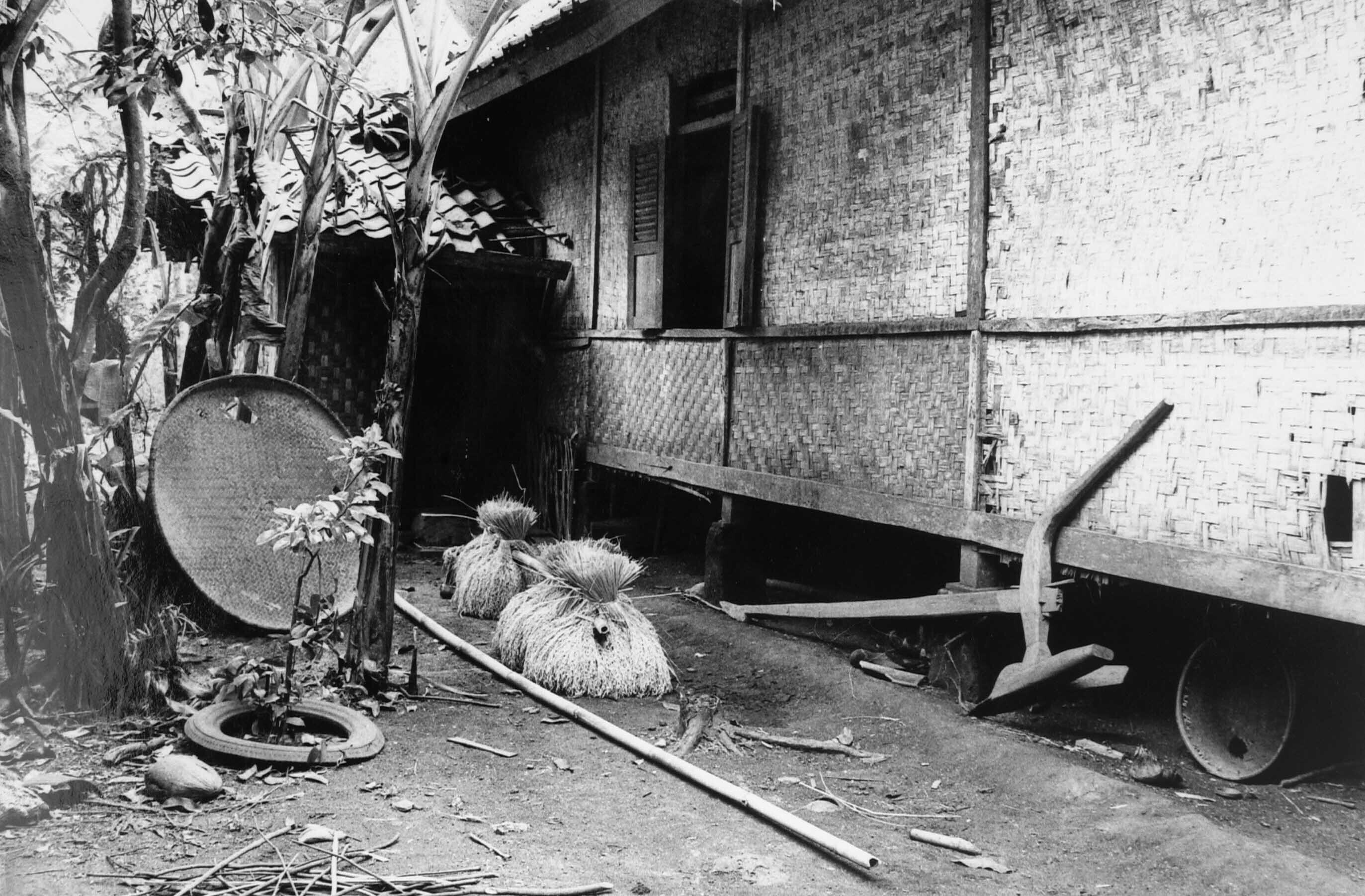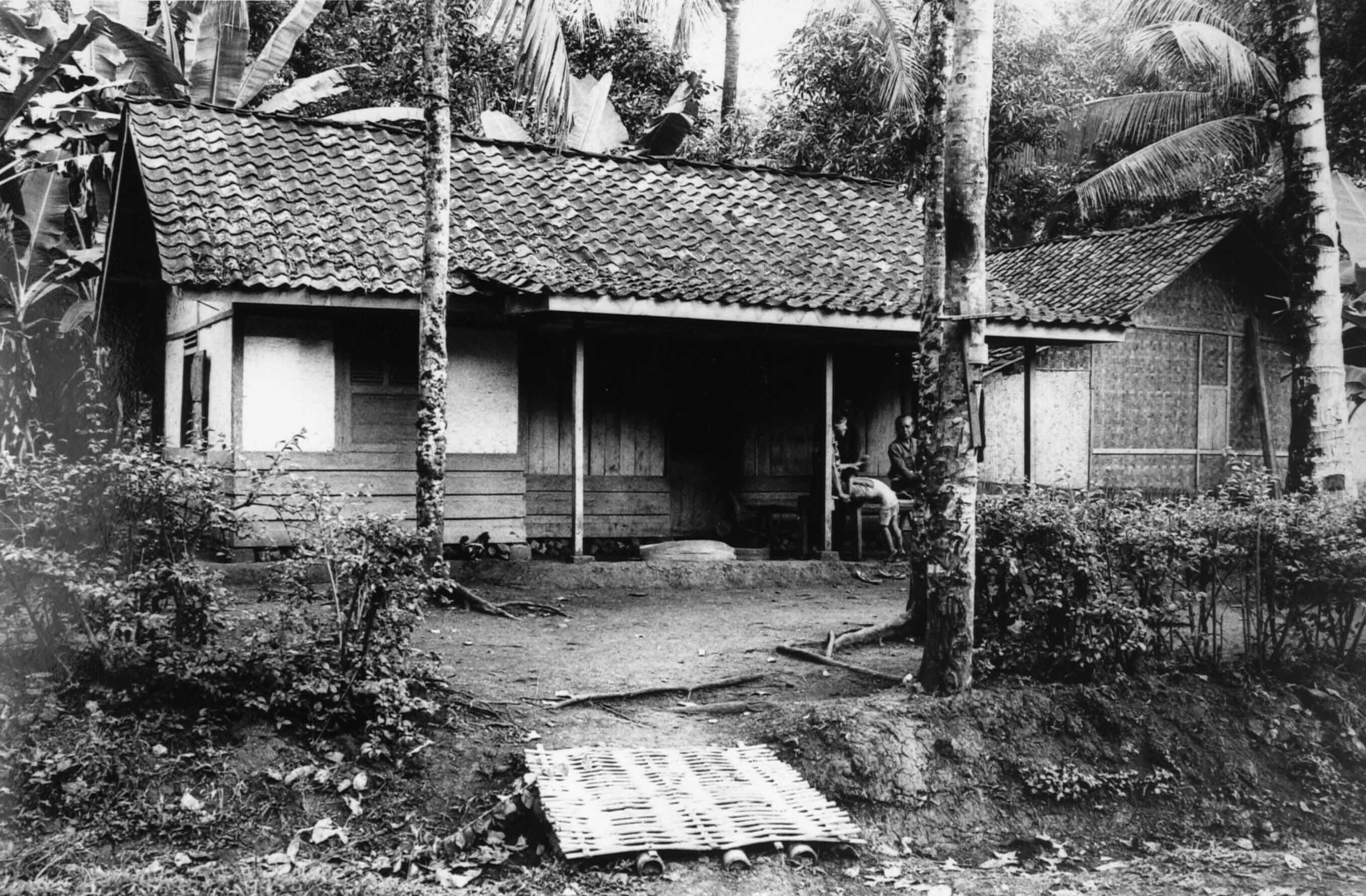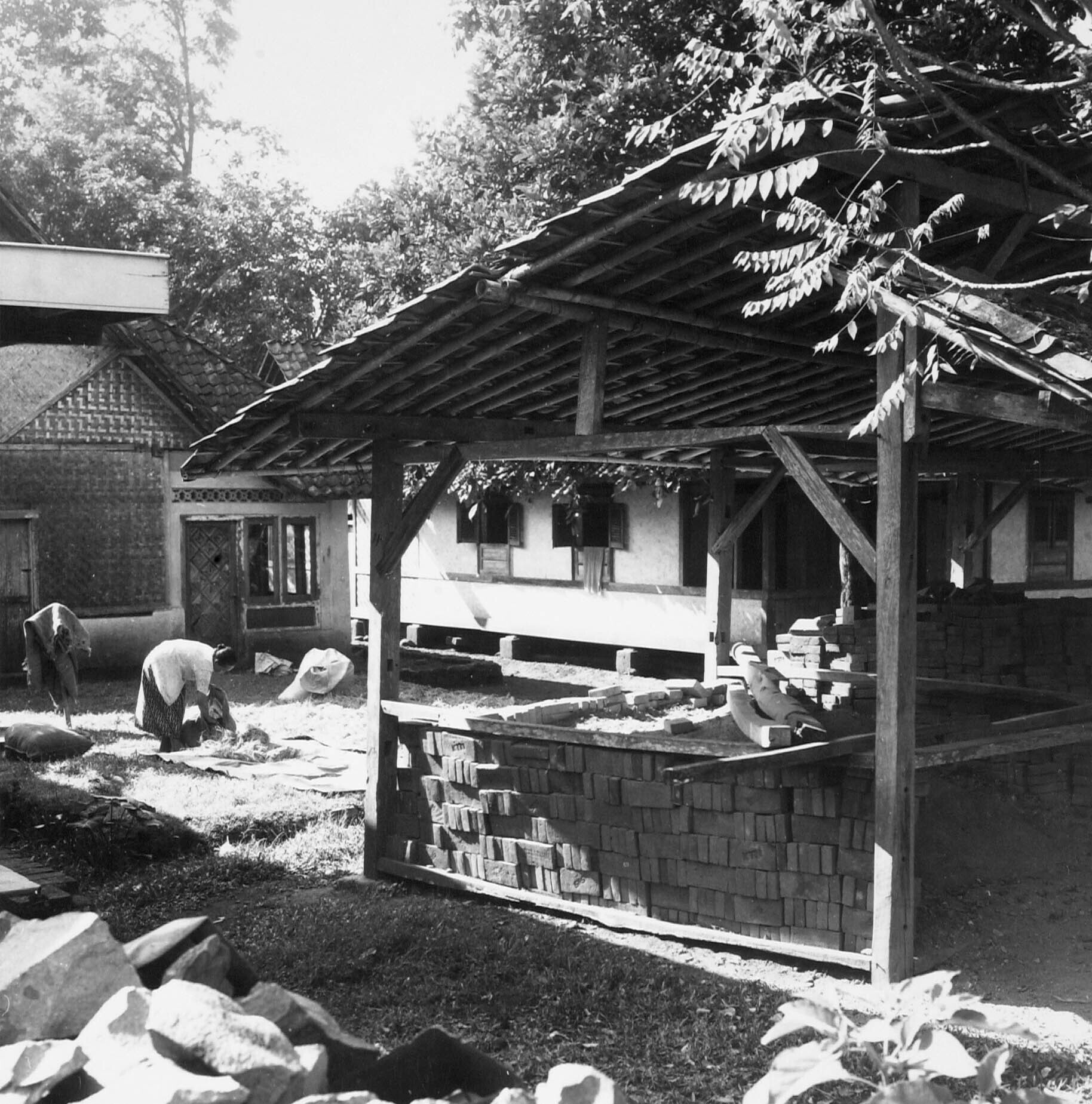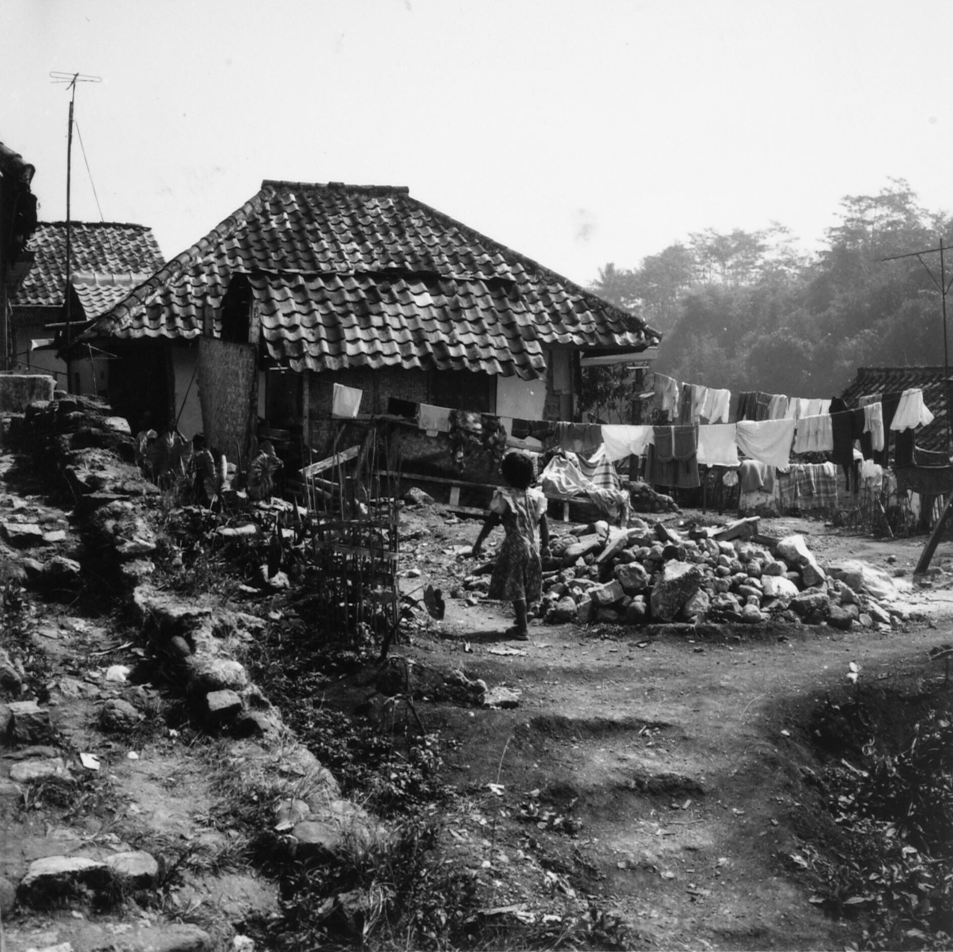 Woonhuis met erf waarop wasgoed aan de lijn hangt te...