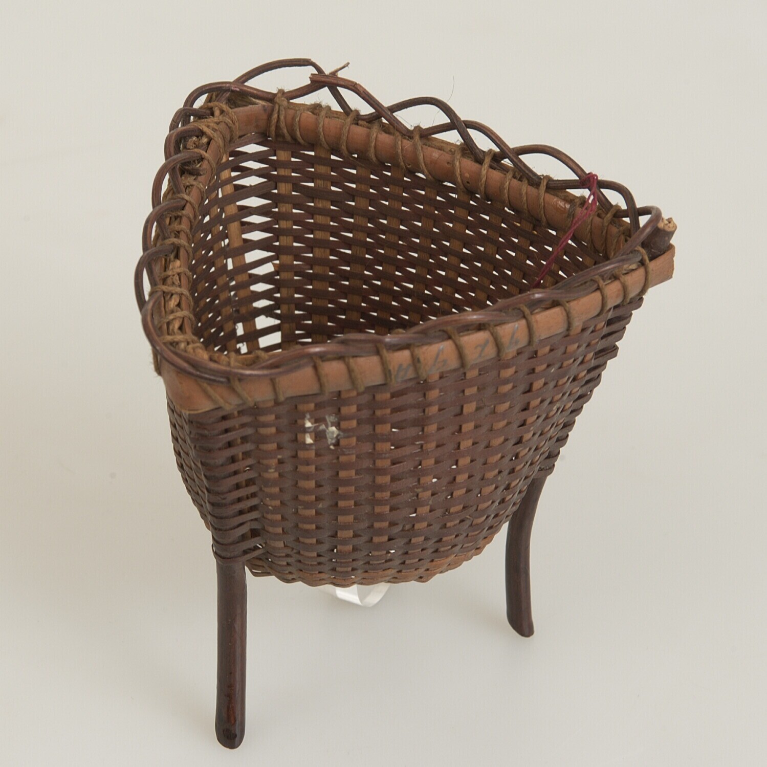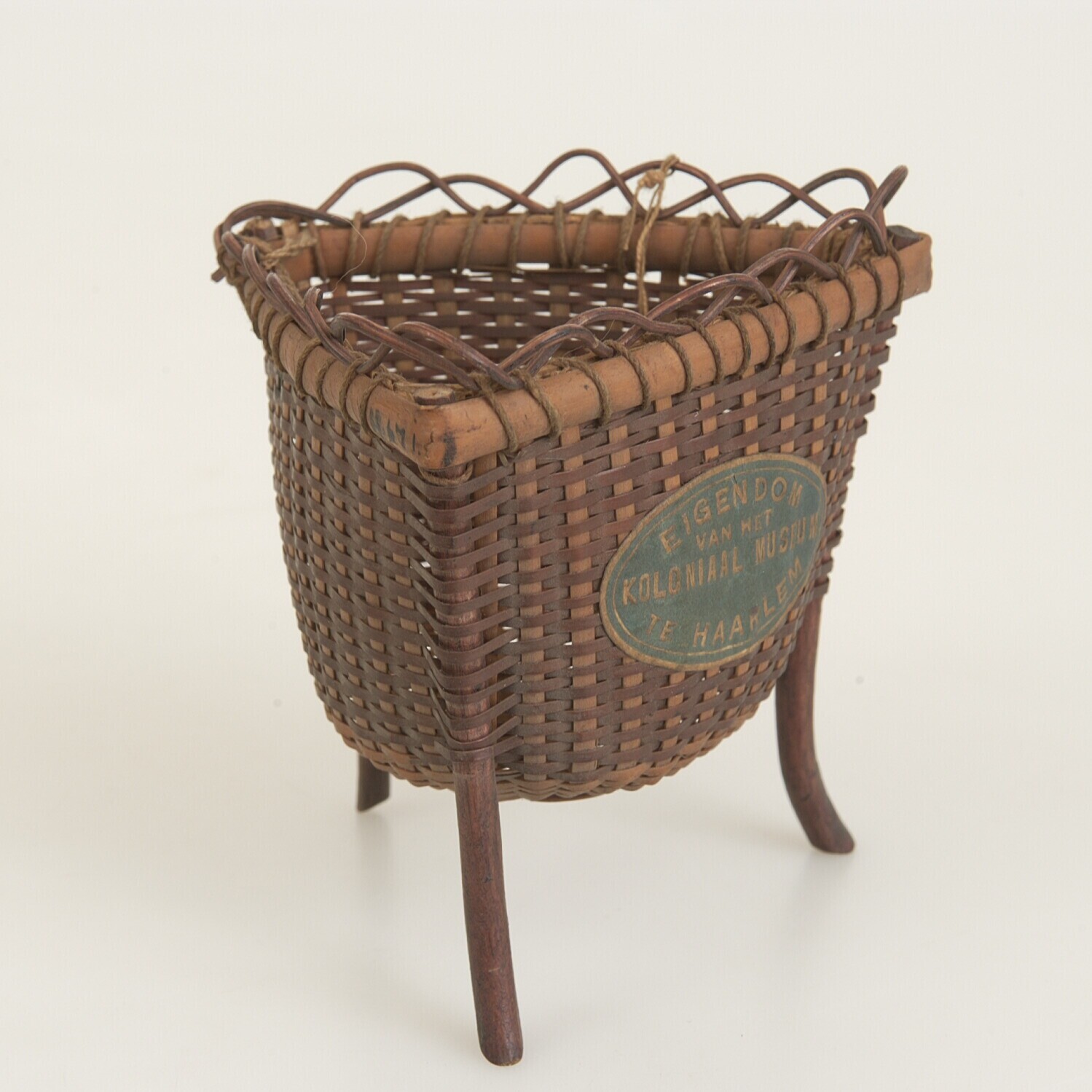 Gevlochten mand van bamboe op drie poten van hout