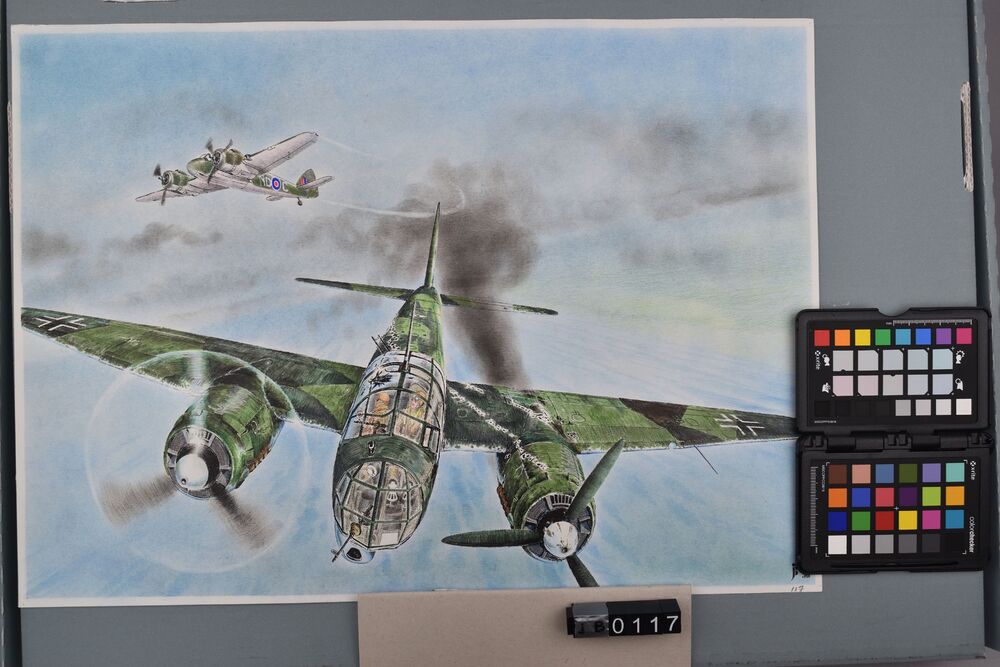 Pasteltekening van een Ju-88 die is aangeschoten doo...
