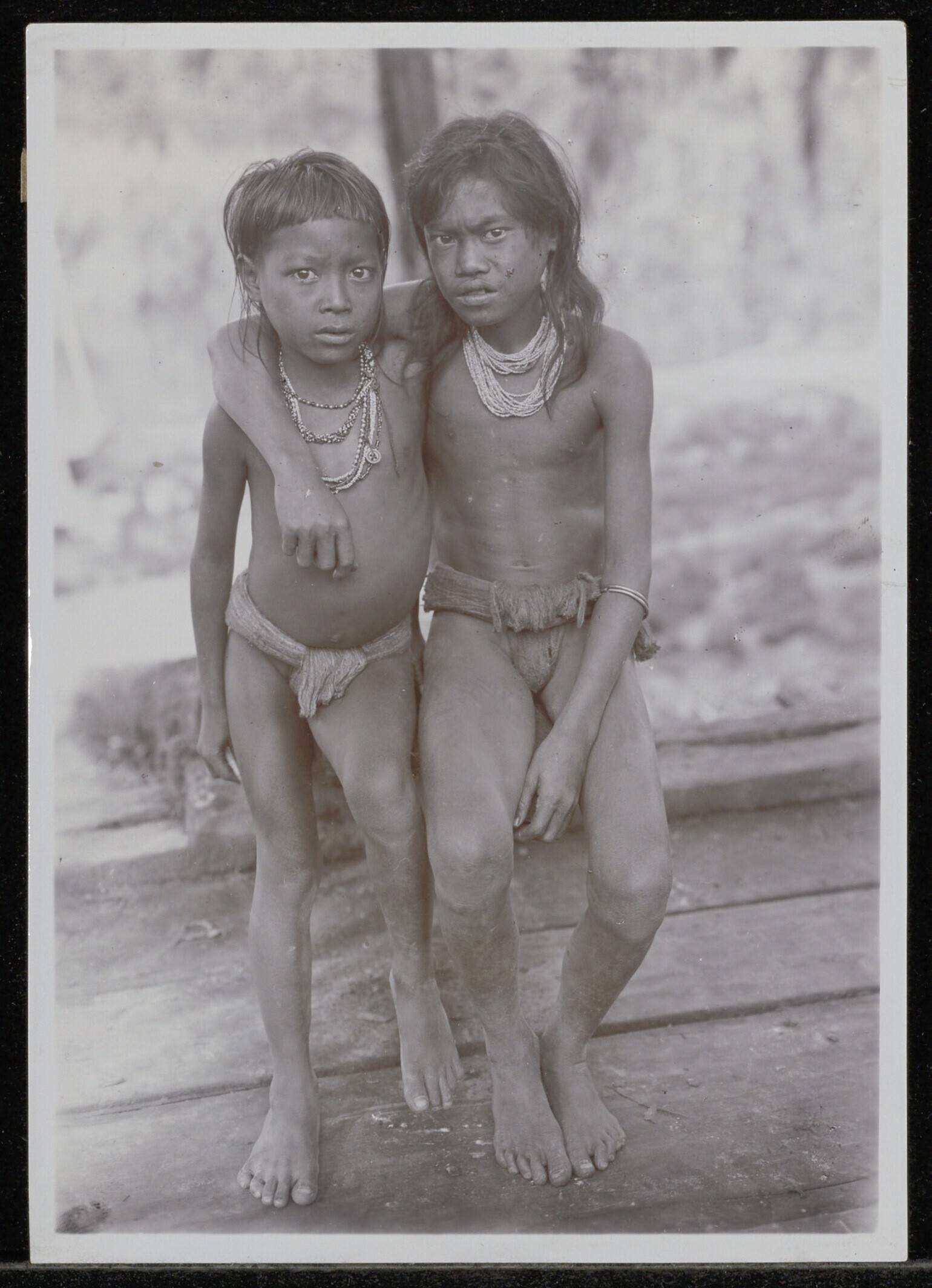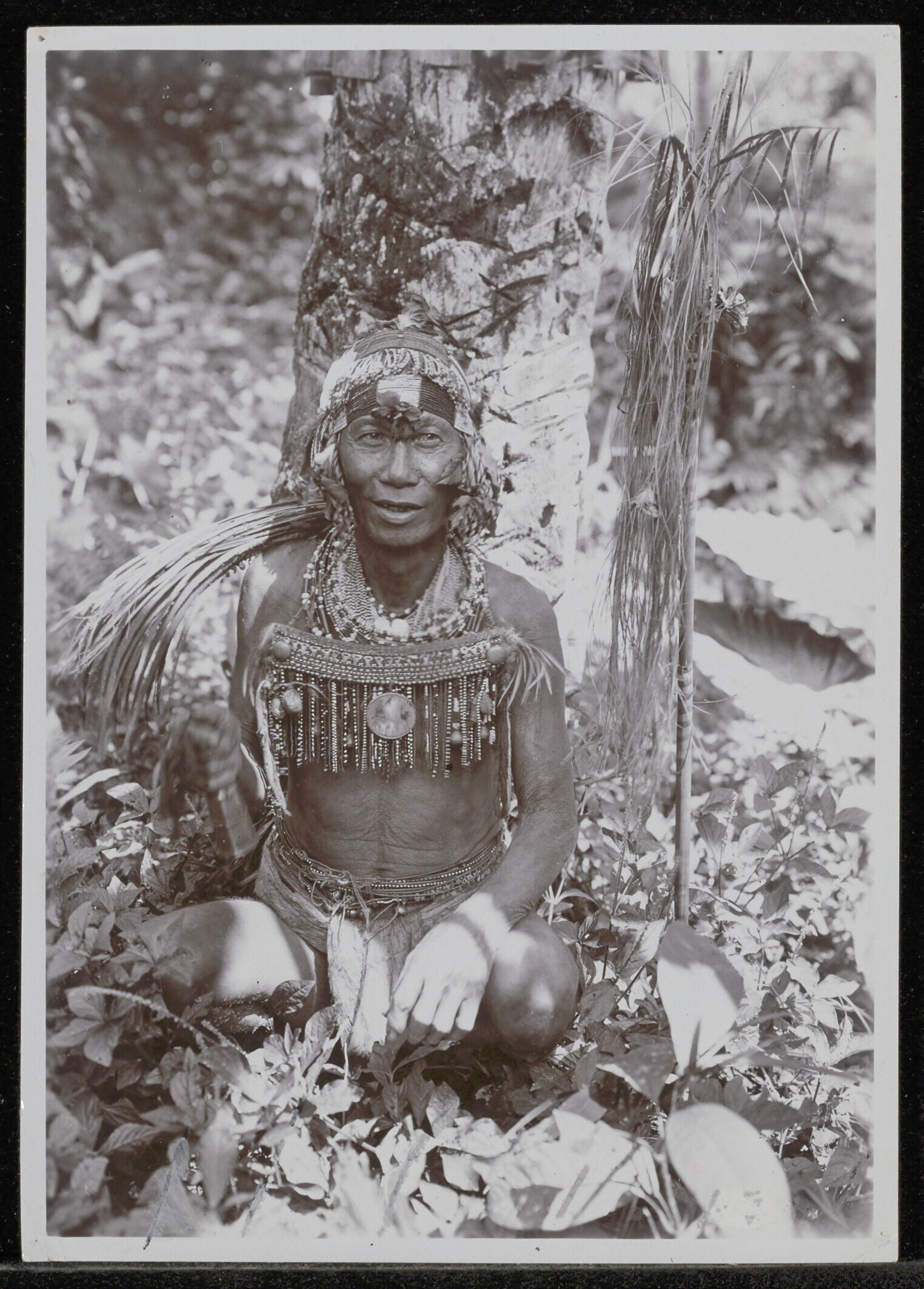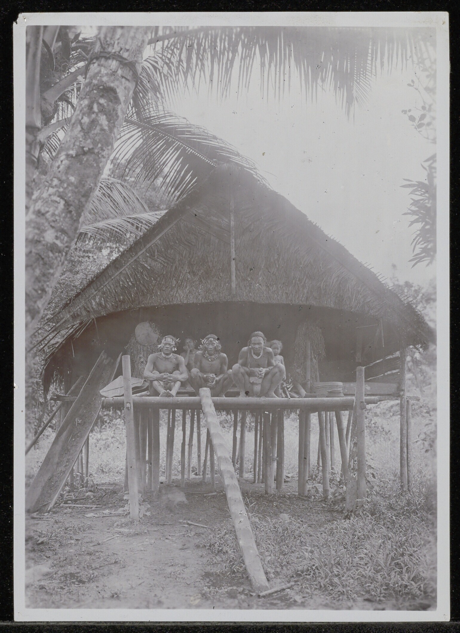 Rokende of kauwende (?) Mentawai mannen bij hun kano...