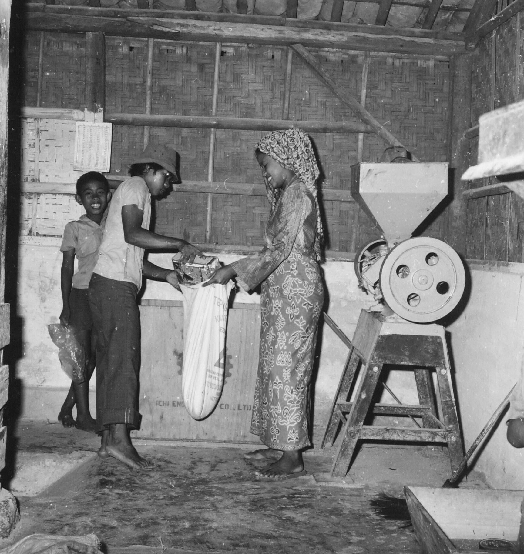 Vrouwen wachten op hun beurt bij de rijstpelmachine ...