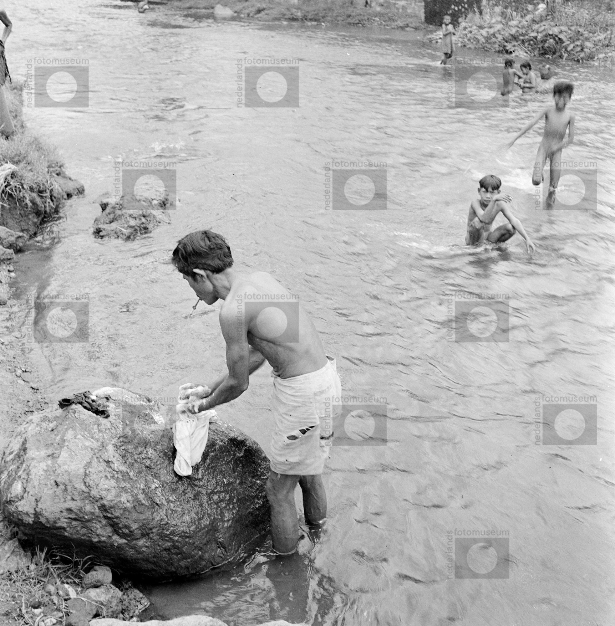 Een man wast zijn kleren in een rivier, terwijl op d...