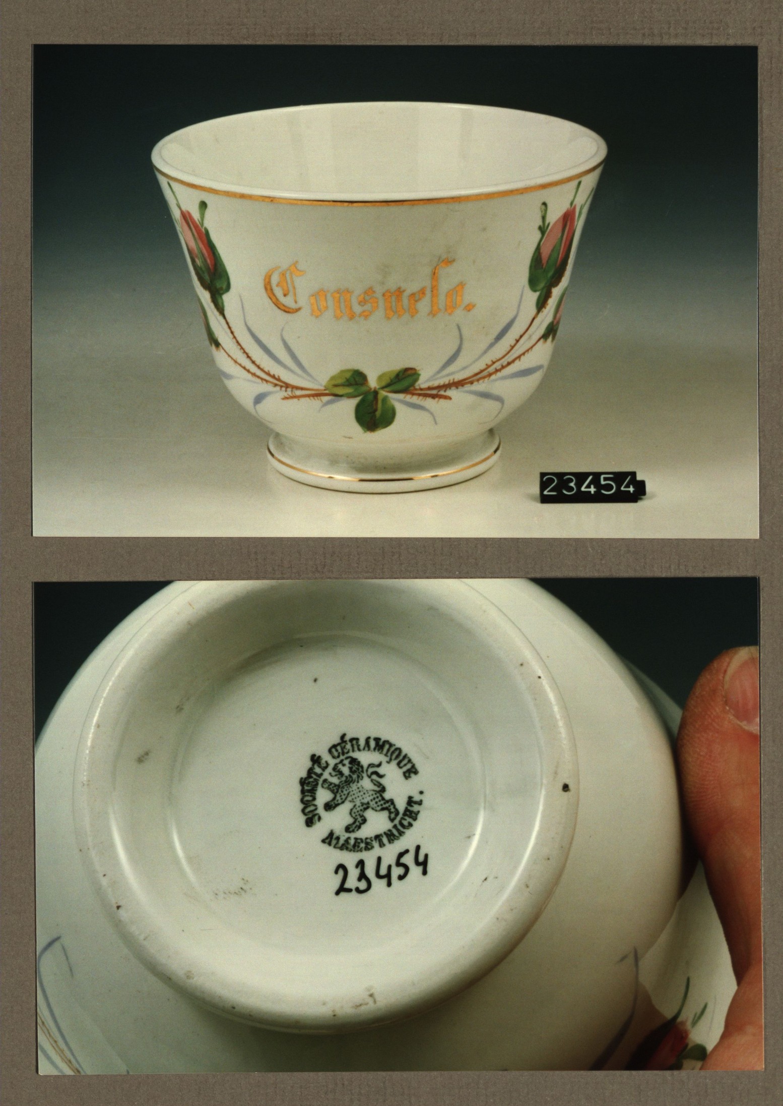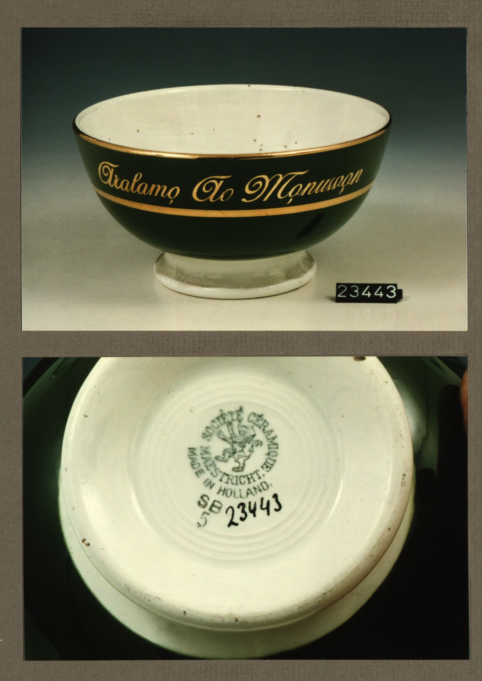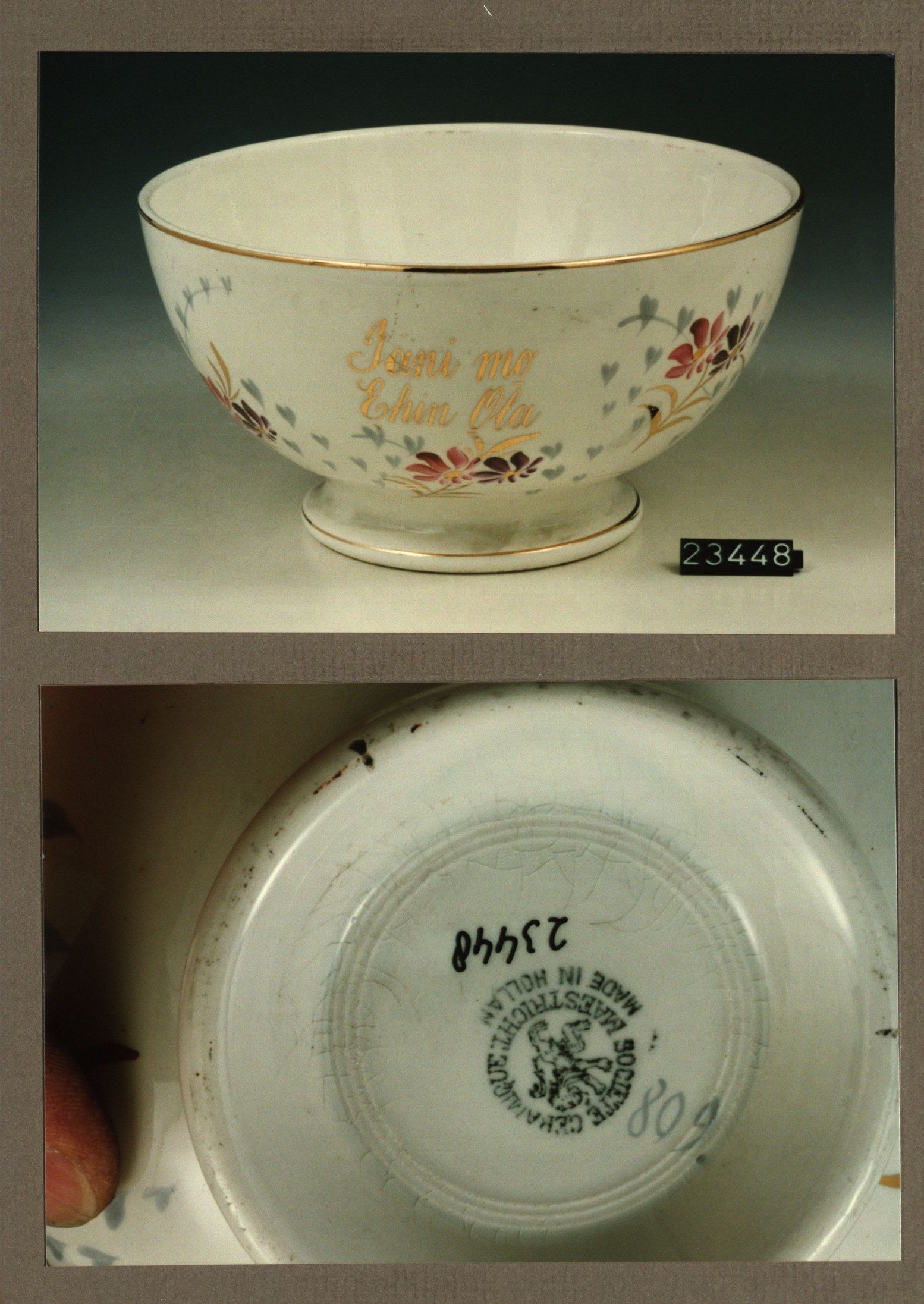 Kom met opschrift, model B uni met decor Consuela