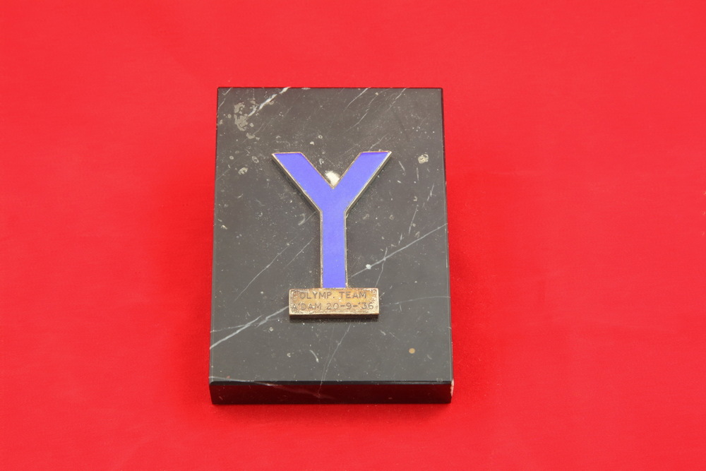 Marmeren plaquette Olymp.team A'dam 20-9-36 ter gele...