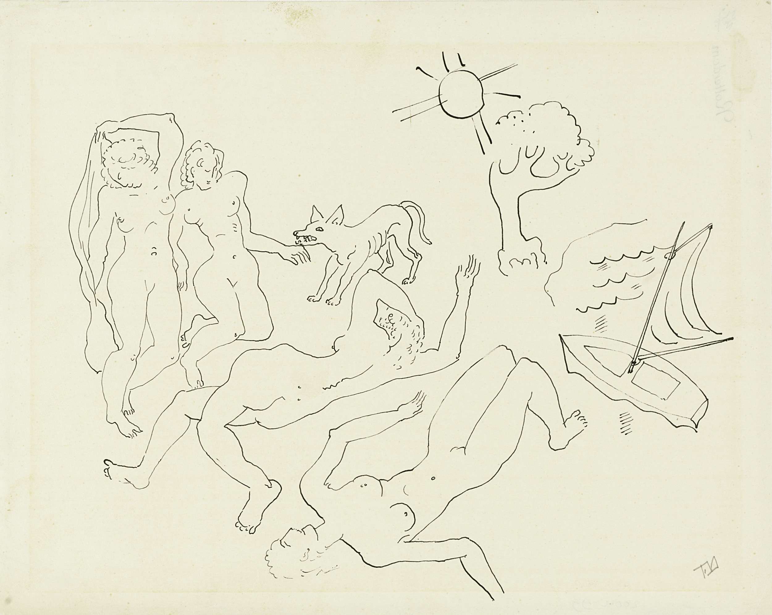 Vier naakte vrouwen met hond en zeilboot
