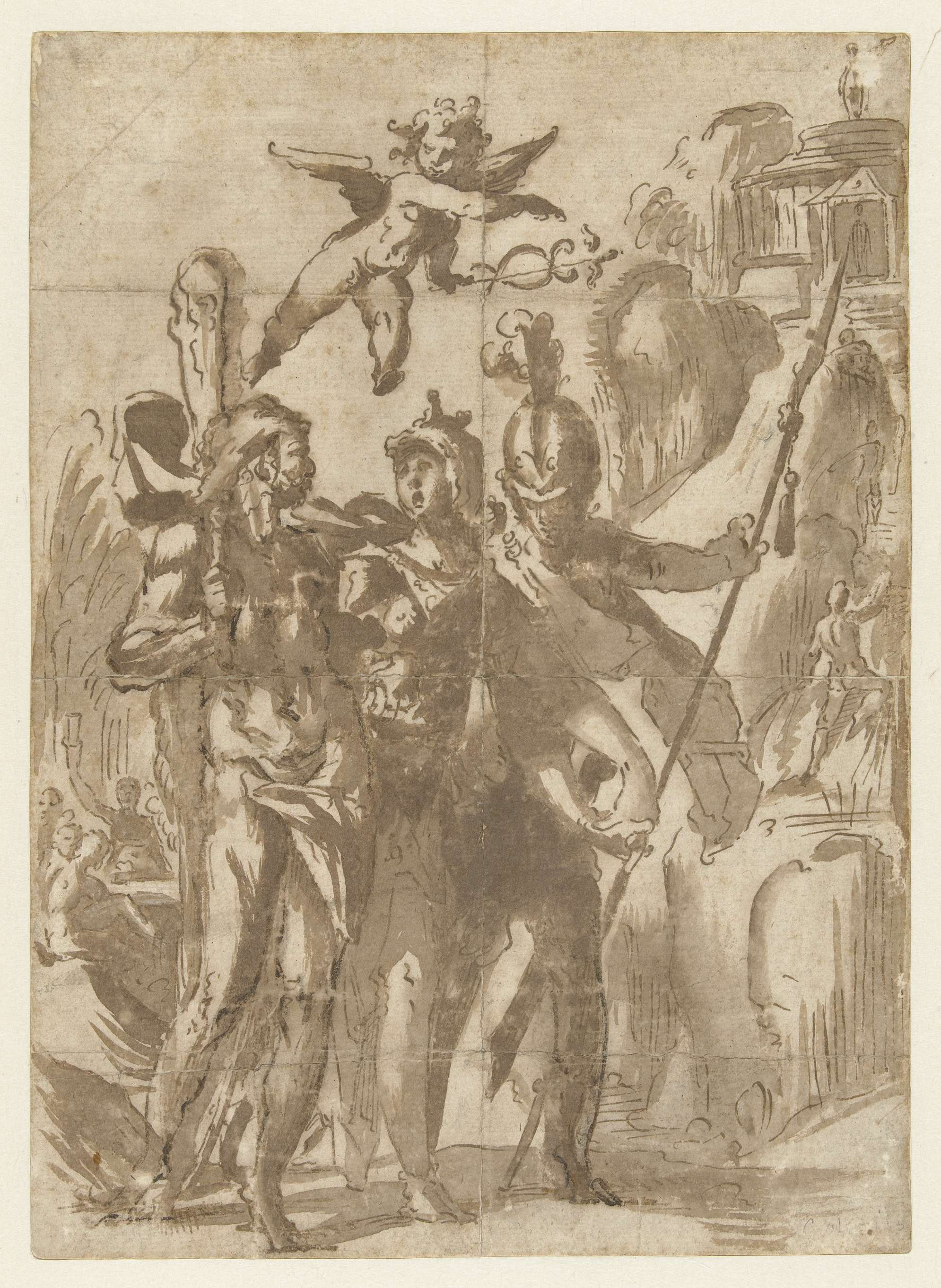 Hercules en Scipio geleid door Minerva op het pad de...