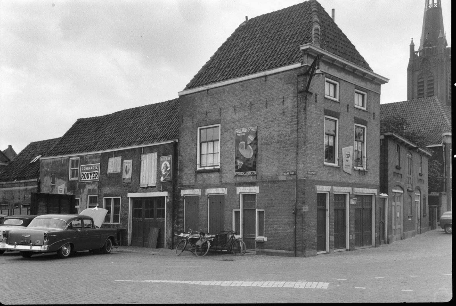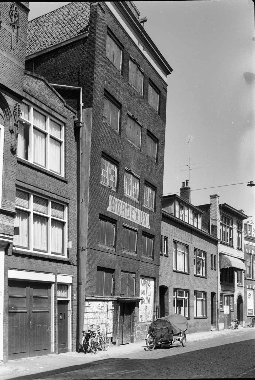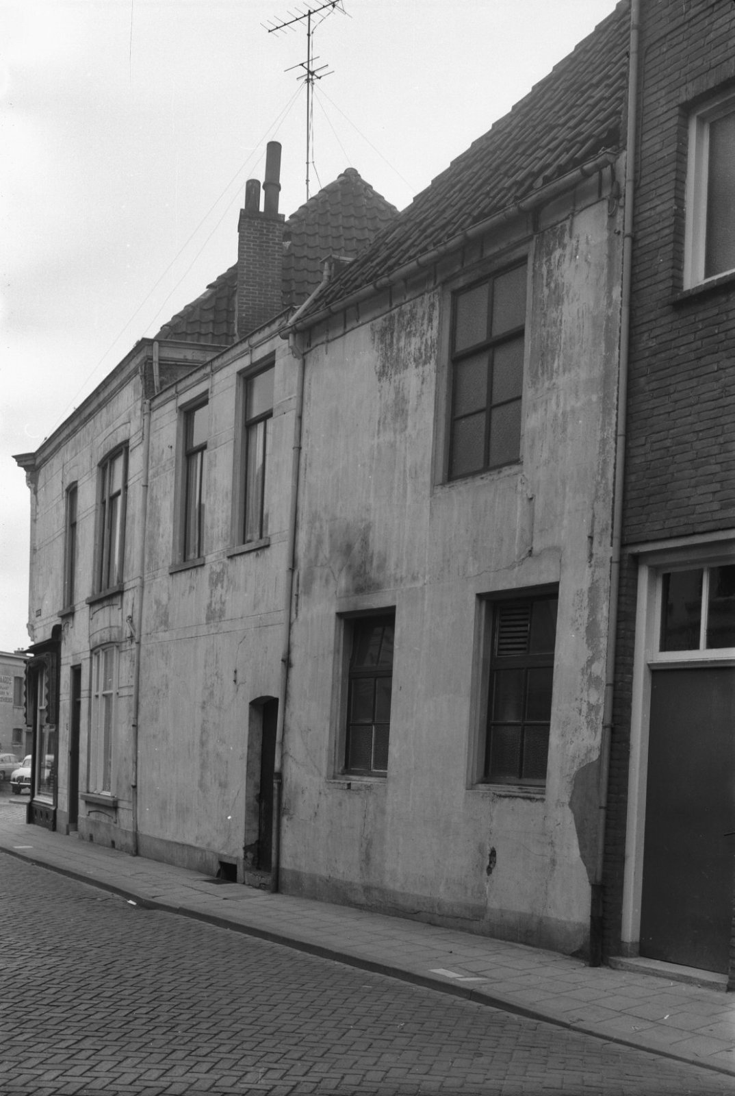 Zijgevel met muurreclames, geparkeerde auto's