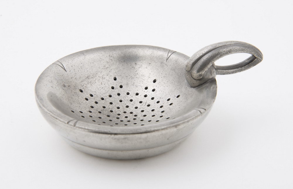 Theezeef met lekbakje van nieuw tin, vervaardigd doo...