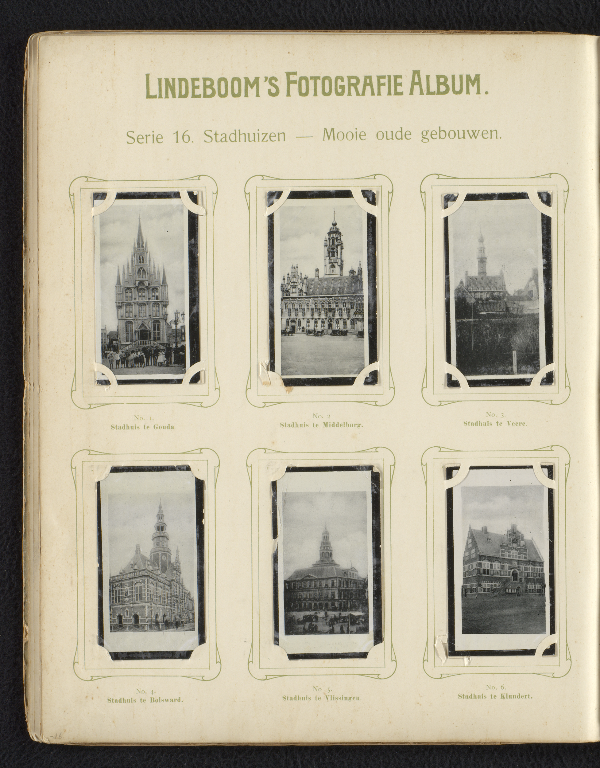 Zes reproducties van foto's van stadhuizen in Nederland