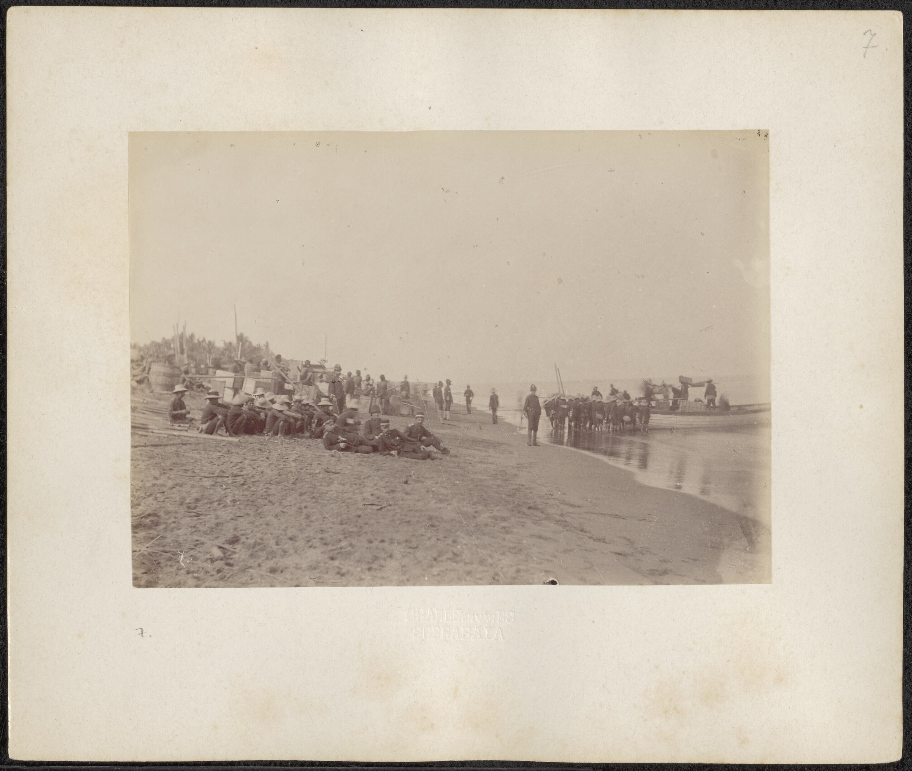 KNIL militairen poseren bij uitgeladen goederen op h...