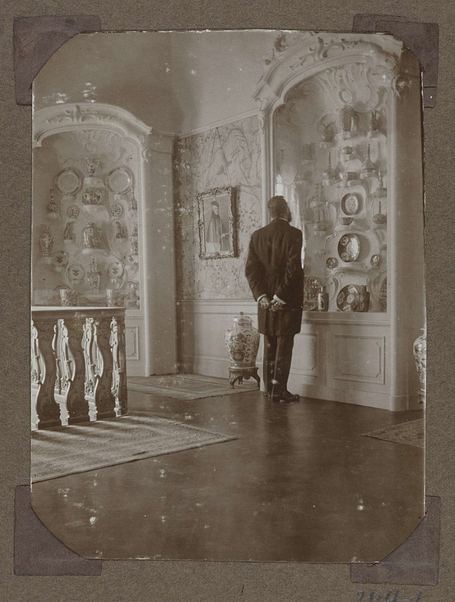 De heer Schmidt-Degener bekijkt het porselein in zaa...