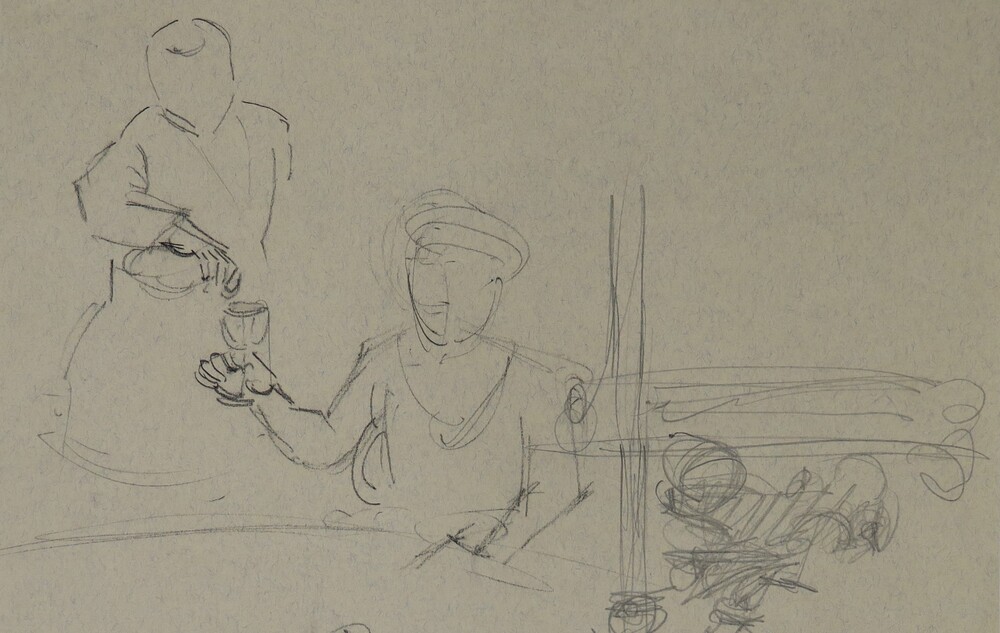 Lakei schenkt glas bij, voorstudie kalenderplaat 'Hu...