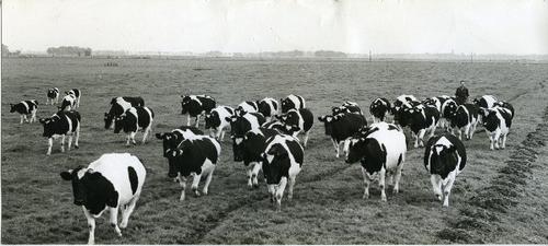 Foto in zwart-wit van koeien die opgehaald worden ui...