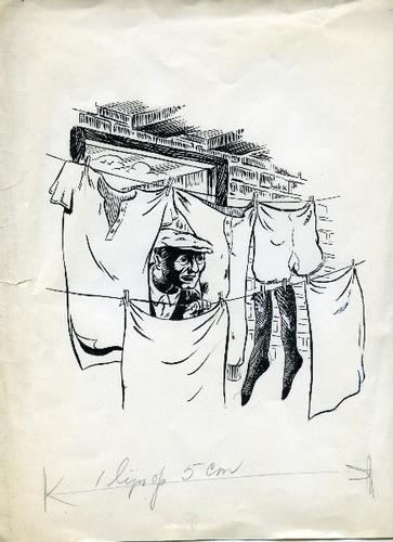 Tekening in zwart-wit van een man die tussen het was...