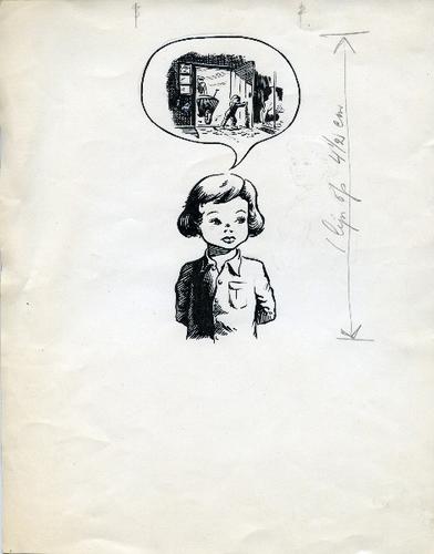 Tekening van een meisje die een deur van een stal op...