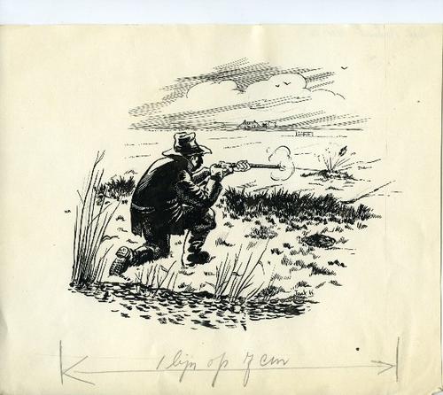 Tekening in zwart-wit van een jager door Jack K., 1954