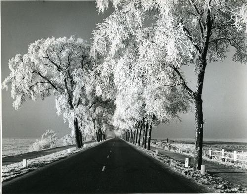 Foto in zwart-wit van berijpte bomen langs een weg d...