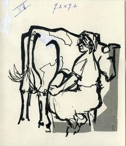 Tekening in zwart-wit van een vrouw die een koe melk...