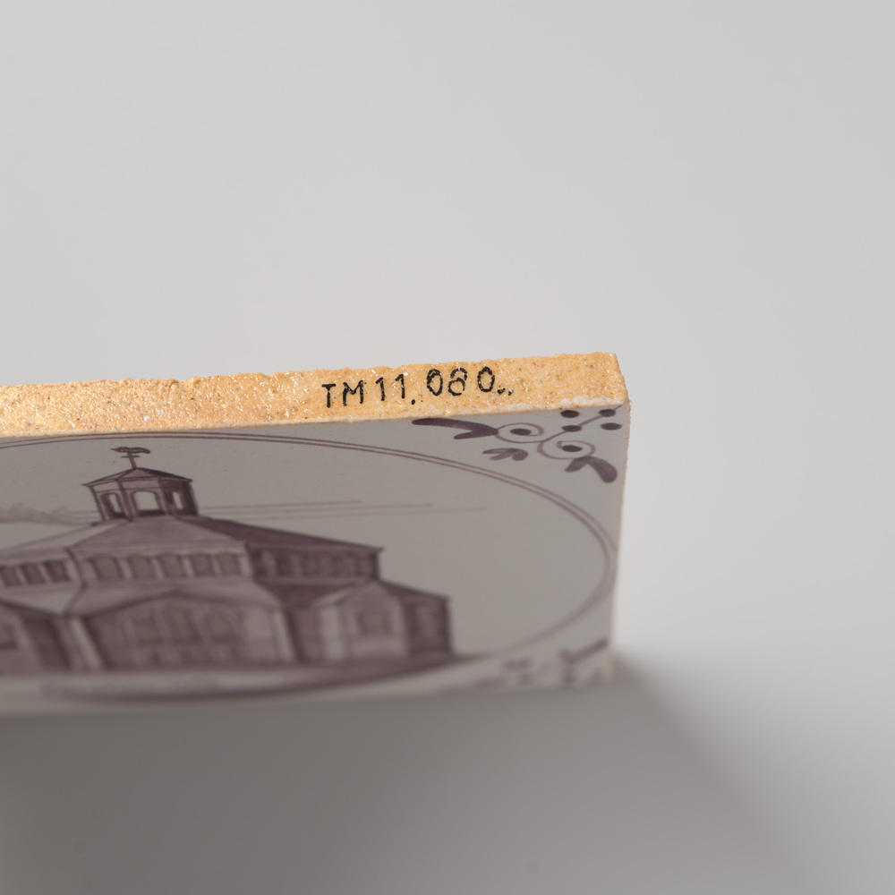 Tegel in tinglazuur, met voorstelling: Kerkgebouw, m...