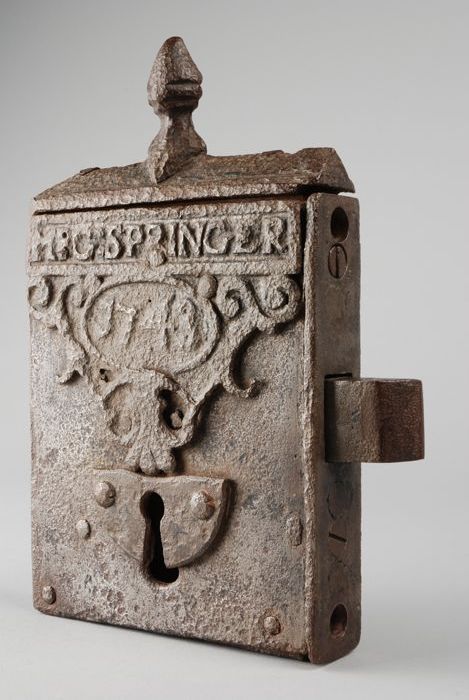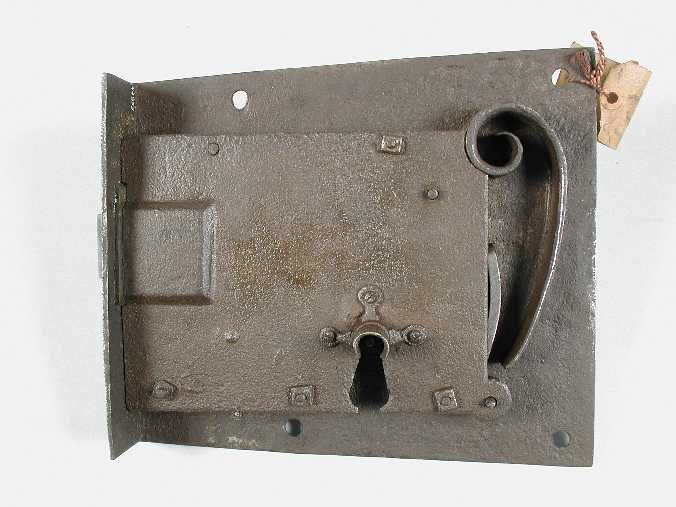 Kastvormig schootgrendelslot met opschrift "MRC. Spr...