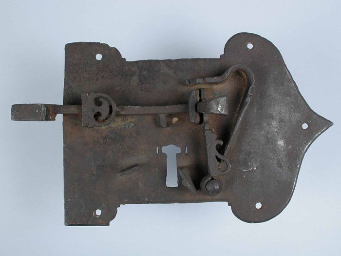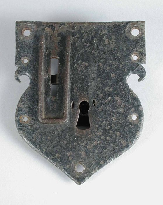 IJzeren overslagslot met slotplaat in sierlijke pijl...