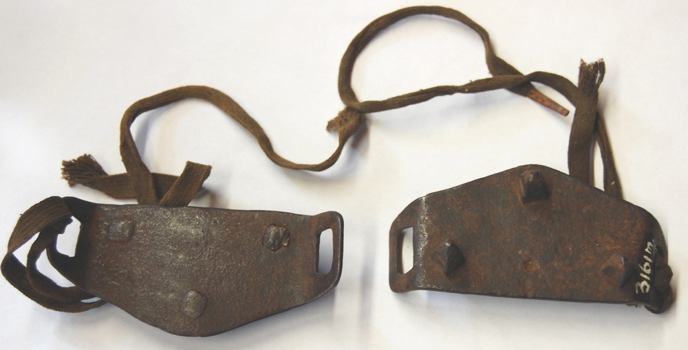 schoenanti-glij-ijzers. Twee ijzers met elk drie pen...