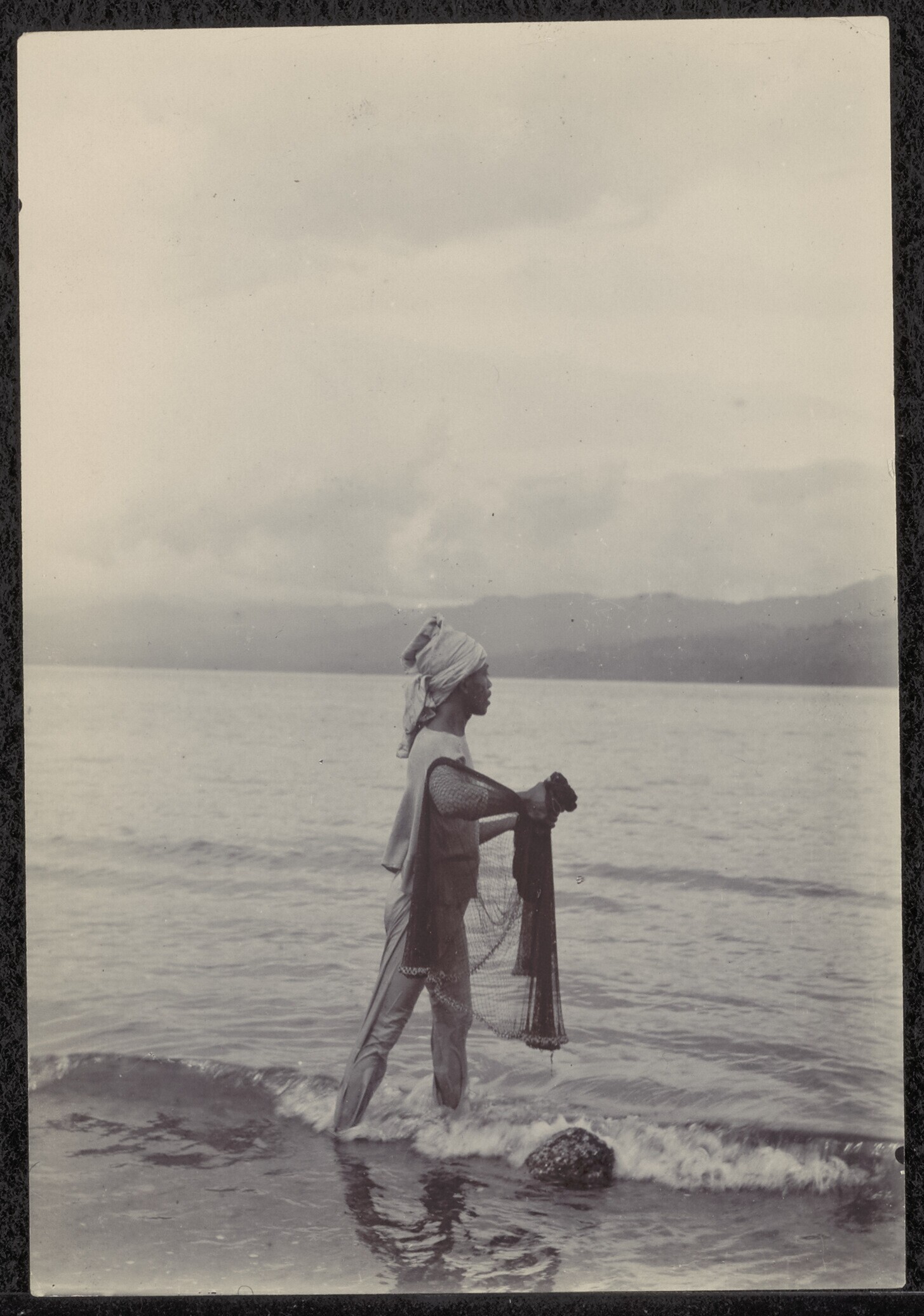 Ambonese visser met een werpnet in de branding