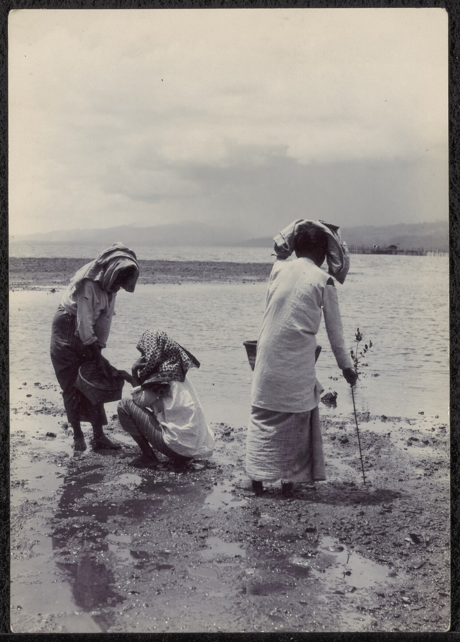 Ambonese vrouwen zoeken krabben langs het strand