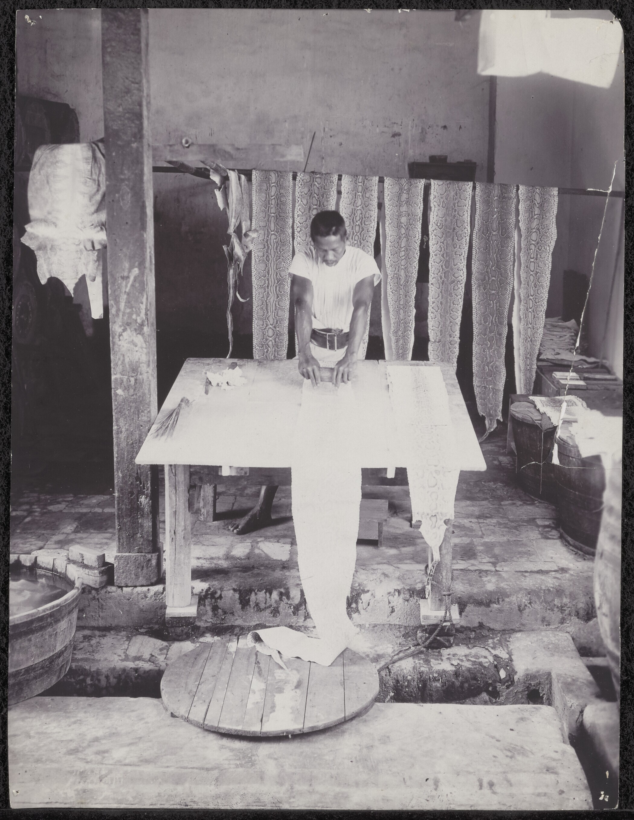 Arbeiders bewerken dierenhuiden, die om te kunnen dr...